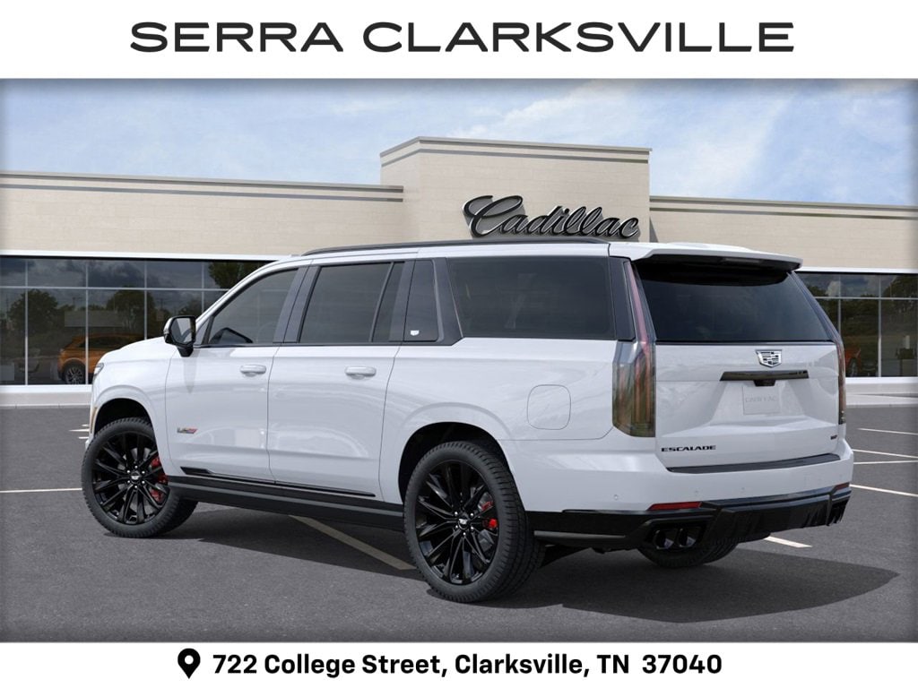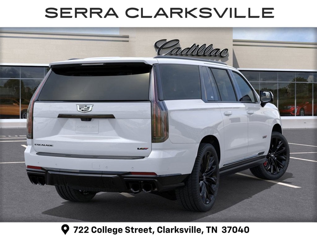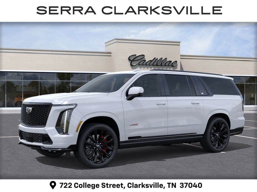 White 2026 Cadillac Escalade ESV V-Series For sale at Serra Cadillac Clarksville is well equipped with: Touring Package (Air Ride Adaptive Suspension, Power Open/Close Doors, and Soft Closing Front and Rear Doors), AWD, 2-Presets Memory For Driver Seat Adjuster, 3.23 Axle Ratio, 3rd row seats: split-bench, 4-Way Power Driver Lumbar Seat Adjuster, 4-Way Power Front Passenger Lumbar Seat Adjuster, 4-Wheel Disc Brakes, 8-Way Power Driver Seat Adjuster, 8-Way Power Front Passenger Seat Adjuster, ABS brakes, Active Noise Cancellation, Adaptive suspension, Air Conditioning, AKG Studio Reference 38-Speaker Audio System, Alloy wheels, AM/FM radio: SiriusXM with 360L, Apple CarPlay/Android Auto, Audio memory, Auto High-beam Headlights, Auto tilt-away steering wheel, Auto-dimming door mirrors, Auto-dimming Rear-View mirror, Automatic temperature control, Blind Zone Steering Assist with Trailering, Brake assist, Bumpers: body-color, Compass, Delay-off headlights, Door Lock and Latch Shields, Driver door bin, Driver Seat Power Bolster, Driver vanity mirror, Dual front impact airbags, Dual front side impact airbags, Electronic Limited-Slip Differential, Electronic Stability Control, Emergency communication system: OnStar Services capable, Exterior Parking Camera Rear, Four wheel independent suspension, Front anti-roll bar, Front Bucket Seats, Front Center Armrest w/Storage, Front dual zone A/C, Front Passenger Seat Power Bolster, Front reading lights, Full Semi-Aniline Leather Seats with Mondrian Quilting, Fully automatic headlights, Garage door transmitter, Genuine wood console insert, Genuine wood dashboard insert, Genuine wood door panel insert, Glass Breakage Sensor, Headphones, Heads-Up Display, Heated and Ventilated Driver and Front Passenger Seats, Heated door mirrors, Heated Driver and Front Passenger Seats, Heated front seats, Heated rear seats, Heated steering wheel, Hitch Guidance with Hitch View, Illuminated entry, Illuminating Front and Rear Sill Plates, Integrated Trailer Brake Controller, Knee airbag, Lane Departure Warning System, Leather steering wheel, Low tire pressure warning, Magnetic Ride Control Suspension, Memory seat, Navigation System, Night Vision, Night vision lights, Occupant sensing airbag, Outside temperature display, Overhead airbag, Overhead console, Panic alarm, Passenger door bin, Passenger vanity mirror, Platinum Interior Trim, Power door mirrors, Power driver seat, Power Liftgate, Power Lumbar Massage Driver Seat, Power Lumbar Massage Front Passenger Seat, Power moonroof, Power Panoramic Tilt-Sliding Sunroof, Power passenger seat, Power steering, Power windows, Power-Retractable Assist Steps, Radio data system, Radio: Infotainment Experience, Rain sensing wipers, Rear air conditioning, Rear anti-roll bar, Rear audio controls, Rear reading lights, Rear Seat Entertainment System, Rear window defroster, Rear window wiper, Reconfigurable Full-Color Head-Up Display, Remote keyless entry, Security system, SiriusXM with 360L Trial Subscription, Smart Trailer Integration Indicator, Speed control, Split folding rear seat, Spoiler, Steering wheel memory, Steering wheel mounted audio controls, Tachometer, Telescoping steering wheel, Theft-Deterrent Alarm System, Tilt steering wheel, Traction control, Trailering App, Trailering Assist Guidelines, Trip computer, Turn signal indicator mirrors, Variably intermittent wipers, Vehicle Inclination Sensor, Vehicle Interior Movement Sensor, Ventilated front seats, Voltmeter, Wheel Locks, Wheels: 24 Split 6-Spoke Alloy, and Wireless Apple CarPlay/Wireless Android Auto.
