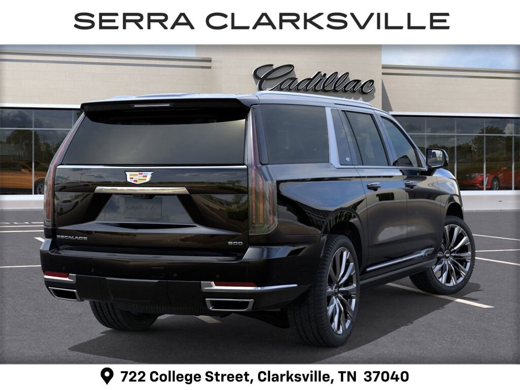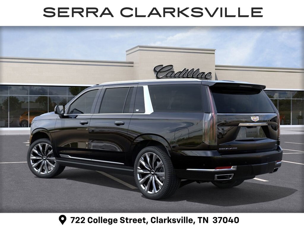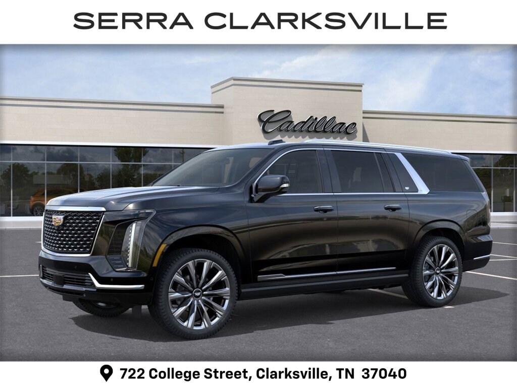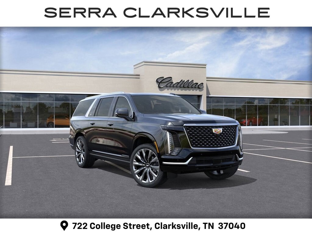 Raven Black 2026 Cadillac Escalade ESV Luxury For sale at Serra Cadillac Clarksville is well equipped with: 4WD, 2-Presets Memory For Driver Seat Adjuster, 2-Speed Active Transfer Case, 21 Speakers, 3.23 Axle Ratio, 3rd row seats: split-bench, 4-Way Power Driver Lumbar Seat Adjuster, 4-Way Power Front Passenger Lumbar Seat Adjuster, 4-Wheel Disc Brakes, 8-Way Power Driver Seat Adjuster, 8-Way Power Front Passenger Seat Adjuster, ABS brakes, Adaptive suspension, Air Conditioning, AKG Studio 21-Speaker Audio System, Alloy wheels, AM/FM radio: SiriusXM with 360L, Apple CarPlay/Android Auto, Audio memory, Auto High-beam Headlights, Auto tilt-away steering wheel, Auto-dimming door mirrors, Auto-dimming Rear-View mirror, Automatic temperature control, Blind Zone Steering Assist w/Trailering, Brake assist, Bumpers: body-color, Compass, Delay-off headlights, Door Lock & Latch Shields, Driver door bin, Driver vanity mirror, Dual front impact airbags, Dual front side impact airbags, Electronic Limited-Slip Differential, Electronic Stability Control, Emergency communication system: OnStar Services capable, Exterior Parking Camera Rear, Four wheel independent suspension, Front anti-roll bar, Front Bucket Seats, Front Center Armrest w/Storage, Front dual zone A/C, Front reading lights, Fully automatic headlights, Garage door transmitter, Glass Breakage Sensor, Heads-Up Display, Heated & Ventilated Driver & Front Passenger Seats, Heated door mirrors, Heated Driver & Front Passenger Seats, Heated front seats, Heated rear seats, Heated steering wheel, Hitch Guidance w/Hitch View, Illuminated entry, Illuminating Front & Rear Sill Plates, Integrated Trailer Brake Controller, Knee airbag, Lane Departure Warning System, Leather Seating Surfaces w/Precision Perf Inserts, Low tire pressure warning, Magnetic Ride Control Suspension, Memory seat, Navigation System, Occupant sensing airbag, Outside temperature display, Overhead airbag, Overhead console, Panic alarm, Passenger door bin, Passenger vanity mirror, Power door mirrors, Power driver seat, Power Liftgate, Power moonroof, Power Panoramic Tilt-Sliding Sunroof, Power passenger seat, Power steering, Power windows, Power-Retractable Assist Steps, Radio data system, Radio: Infotainment Experience, Rain sensing wipers, Rear air conditioning, Rear anti-roll bar, Rear reading lights, Rear window defroster, Rear window wiper, Reconfigurable Full-Color Head-Up Display, Remote keyless entry, Security system, SiriusXM w/360L Trial Subscription, Smart Trailer Integration Indicator, Speed control, Split folding rear seat, Spoiler, Steering wheel memory, Steering wheel mounted audio controls, Tachometer, Telescoping steering wheel, Theft-Deterrent Alarm System, Tilt steering wheel, Traction control, Trailering App, Trailering Assist Guidelines, Trip computer, Turn signal indicator mirrors, Variably intermittent wipers, Vehicle Inclination Sensor, Vehicle Interior Movement Sensor, Ventilated front seats, Voltmeter, Wheel Locks, Wheels: 22 9-Spoke Alloy w/Polished Finish, and Wireless Apple CarPlay/Wireless Android Auto.Ask us about special APR rates, lease offers and incentives available on most new 2026 Escalade ESVs. If you're shopping for a new Luxury SUV near Nashville, look no further than Serra Cadillac Clarksville, 722 College Street, Clarksville, TN Call 888-399-7307 or online at SerraCadillacClarksville.com. Veteran Owned-Value Driven, Serra Cadillac is the dealer of choice for Nashville and the surrounding area.