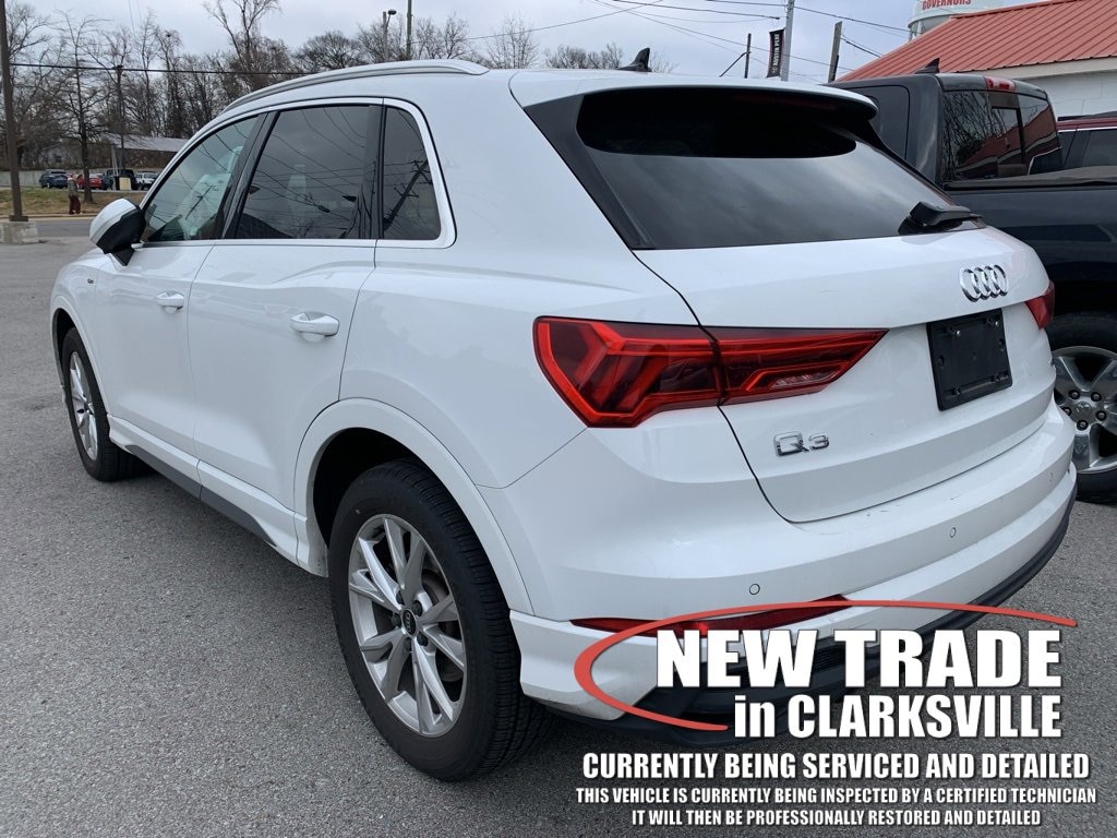 The Pre-Owned 2023 Audi Q3 Premium with 2.0L 4-Cylinder TFSI at Serra Clarksville. Well equipped: 10 Speakers, 3.533 Axle Ratio, 4-Wheel Disc Brakes, ABS brakes, Air Conditioning, Alloy wheels, AM/FM radio, Audi smartphone interface (Apple CarPlay/Android Auto), Auto High-beam Headlights, Automatic temperature control, Brake assist, Bumpers: body-color, Delay-off headlights, Driver door bin, Driver vanity mirror, Dual front impact airbags, Dual front side impact airbags, Electronic Stability Control, Emergency communication system: Audi connect CARE, Exterior Parking Camera Rear, Four wheel independent suspension, Front anti-roll bar, Front Bucket Seats, Front Center Armrest, Front dual zone A/C, Front fog lights, Front reading lights, Fully automatic headlights, Heated door mirrors, Heated Front Bucket Seats, Heated front seats, Illuminated entry, Knee airbag, Leather Seating Surfaces, Leather Shift Knob, Leather steering wheel, Low tire pressure warning, Occupant sensing airbag, Outside temperature display, Overhead airbag, Overhead console, Panic alarm, Passenger door bin, Passenger vanity mirror, Power door mirrors, Power driver seat, Power Liftgate, Power moonroof: Panoramic, Power passenger seat, Power steering, Power windows, Radio data system, Radio: Audi Sound System, Rain sensing wipers, Rear air conditioning, Rear anti-roll bar, Rear fog lights, Rear reading lights, Rear seat center armrest, Rear window defroster, Rear window wiper, Remote keyless entry, Speed control, Speed-sensing steering, Split folding rear seat, Spoiler, Steering wheel mounted audio controls, Tachometer, Telescoping steering wheel, Tilt steering wheel, Traction control, Trip computer, Turn signal indicator mirrors, Variably intermittent wipers, and Wheels: 18 5-V-Spoke-S Design.