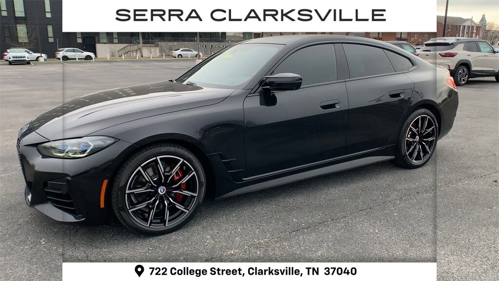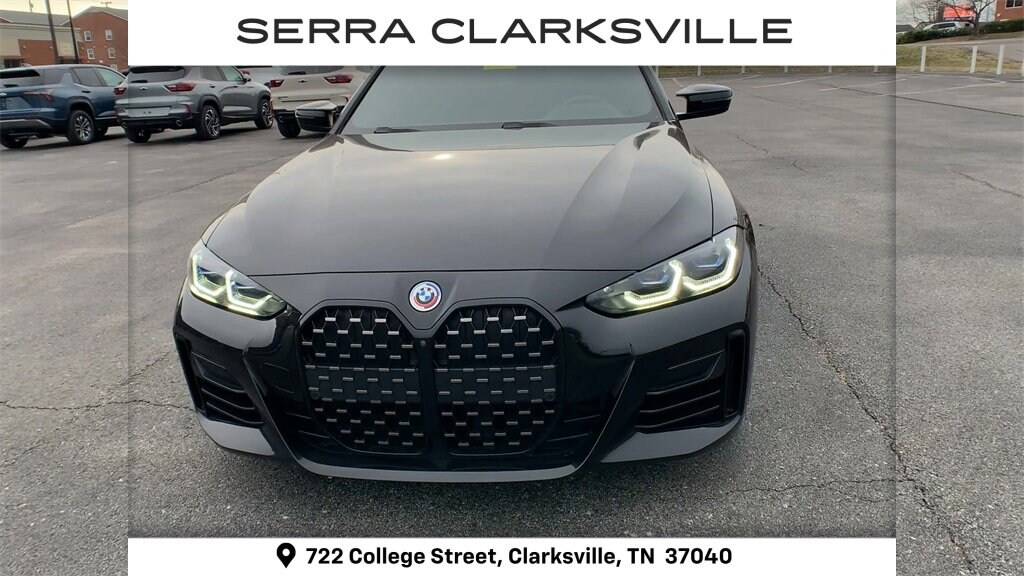 The Pre-Owned 2023 BMW 4 Series M440i xDrive with I6 at Serra Clarksville. Well equipped: M Sport Package Pro, Parking Assistance Package (Active Park Distance Control, Parking Assistant Plus, and Surround View w/3D View), Premium Package (Ambient Lighting, Head-Up Display, Heated Front Seats, and Heated Steering Wheel), Shadowline Package (Extended Shadowline Trim, M Shadowline Lights, and M Sport Brakes w/Red Calipers), 10 Speakers, 4-Wheel Disc Brakes, ABS brakes, Air Conditioning, Alloy wheels, AM/FM radio: SiriusXM, Apple CarPlay & Android Auto Compatibility, Apple CarPlay Compatibility, Auto High-beam Headlights, Auto-dimming door mirrors, Auto-dimming Rear-View mirror, Automatic temperature control, BMW Assist eCall, BMW M 50 Years Emblems (DISC), BMW TeleServices, Brake assist, Bumpers: body-color, Compass, ConnectedDrive Services, Delay-off headlights, Driver door bin, Driver Lumbar Support, Driver vanity mirror, Dual front impact airbags, Dual front side impact airbags, Electronic Stability Control, Emergency communication system: BMW Assist eCall, Exterior Parking Camera Rear, Four wheel independent suspension, Front anti-roll bar, Front Bucket Seats, Front Center Armrest, Front dual zone A/C, Front reading lights, Fully automatic headlights, Garage door transmitter, harman/kardon Surround Sound System, Heated door mirrors, Hi-Fi Sound System, Icon Adaptive LED Headlights w/Laserlight, Illuminated entry, Knee airbag, Leather Shift Knob, Low tire pressure warning, Memory seat, Mobility Kit, Navigation System, Occupant sensing airbag, Open Pore Fine Wood Oak Grain Trim, Outside temperature display, Overhead airbag, Overhead console, Panic alarm, Passenger door bin, Passenger vanity mirror, Perforated Sensatec Upholstery, Power door mirrors, Power driver seat, Power Front Seats, Power Liftgate, Power moonroof, Power passenger seat, Power steering, Power windows, Radio data system, Radio: AM/FM Audio System, Rain sensing wipers, Rear air conditioning, Rear anti-roll bar, Rear reading lights, Rear seat center armrest, Rear window defroster, Remote keyless entry, Security system, Sensatec Dashboard, SiriusXM Satellite Radio, Speed control, Speed-sensing steering, Speed-Sensitive Wipers, Split folding rear seat, Spoiler, Sport Seats, Sport steering wheel, Steering wheel mounted audio controls, Tachometer, Telescoping steering wheel, Tilt steering wheel, Traction control, Trip computer, Turn signal indicator mirrors, Variably intermittent wipers, Wheels: 18 x 8.5 M Bi-Color (Style 858M), and Wheels: 19 x 8.5 Fr & 19 x 9.0 Rr M Y-Spoke.