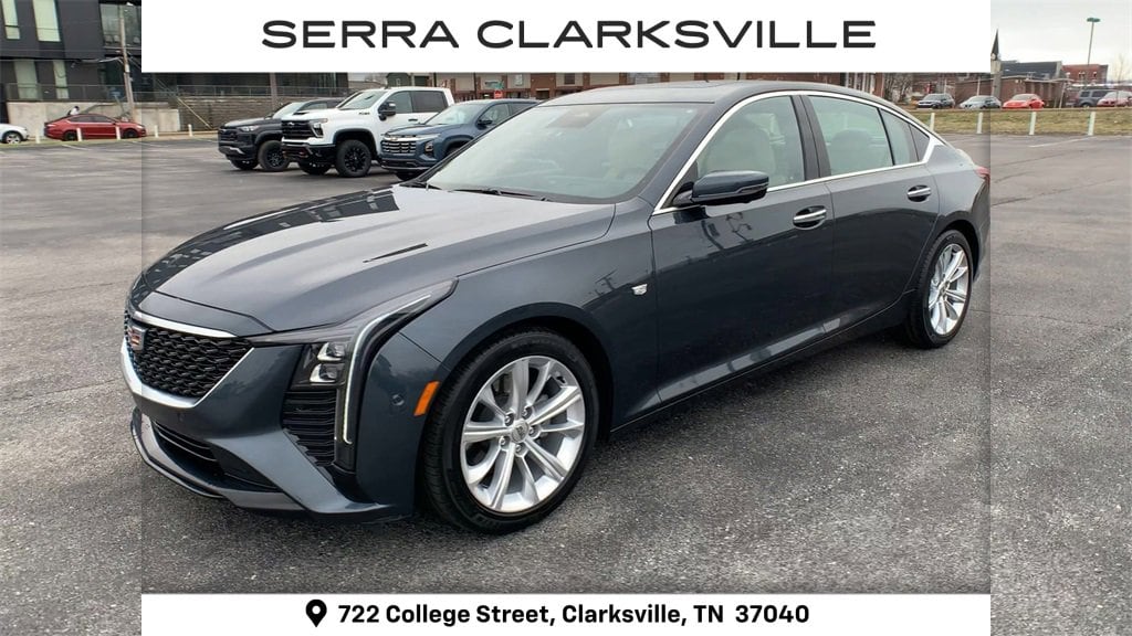 The Pre-Owned 2025 Cadillac CT5 Premium Luxury with 2.0L I4 Turbocharged DOHC 16V LEV3-SULEV30 237hp at Serra Clarksville. Well equipped: 15 Speakers, 4-Wheel Disc Brakes, 8-Way Power Driver Seat Adjuster, 8-Way Power Front Passenger Seat Adjuster, ABS brakes, Air Conditioning, AKG 15-Speaker System, Alloy wheels, AM/FM radio: SiriusXM with 360L, Apple CarPlay/Android Auto, Auto High-beam Headlights, Auto-dimming door mirrors, Auto-dimming Rear-View mirror, Automatic Stop/Start w/Disable, Automatic temperature control, Brake assist, Bumpers: body-color, Compass, Delay-off headlights, Driver 4-Way Power Lumbar Seat Adjuster, Driver door bin, Driver Power Lumbar Massage Seat, Driver Power Seatback Bolster Adjustment, Driver vanity mirror, Dual front impact airbags, Dual front side impact airbags, Electronic Stability Control, Emergency communication system: OnStar and Cadillac connected services capable, Four wheel independent suspension, Front anti-roll bar, Front Bucket Seats, Front Center Armrest, Front dual zone A/C, Front Passenger 4-Way Power Lumbar Seat Adjuster, Front Passenger Power Lumbar Massage Seat, Front Passenger Power Seatback Bolster Adjustment, Front reading lights, Fully automatic headlights, Garage door transmitter, Heated door mirrors, Heated Driver & Front Passenger Seats, Heated front seats, Heated steering wheel, Illuminated entry, Knee airbag, Leather Seating Surfaces w/Mini-Perforated Inserts, Leather steering wheel, LED Reflective Windshield Collision Alert, Low tire pressure warning, Memory seat, Navigation System, Occupant sensing airbag, Outside temperature display, Overhead airbag, Overhead console, Panic alarm, Passenger door bin, Passenger vanity mirror, Power door mirrors, Power driver seat, Power passenger seat, Power steering, Power windows, Radio data system, Radio: Google Built-In Infotainment Experience, Rain sensing wipers, Rear anti-roll bar, Rear reading lights, Rear seat center armrest, Rear window defroster, Remote keyless entry, SiriusXM w/360L Trial Subscription, Speed control, Speed-sensing steering, Split folding rear seat, Steering wheel memory, Steering wheel mounted audio controls, Tachometer, Telescoping steering wheel, Tilt steering wheel, Traction control, Trip computer, Turn signal indicator mirrors, Variably intermittent wipers, Ventilated Driver & Front Passenger Seats, Ventilated front seats, Voltmeter, and Wheels: 18 Premium Painted Alloy.