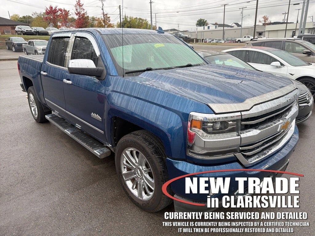 The Pre-Owned 2017 Chevrolet Silverado 1500 High Country with EcoTec3 5.3L V8 at Serra Clarksville. Well equipped: Enhanced Driver Alert Package (Forward Collision Alert, IntelliBeam Automatic High Beam On/Off Headlight, Lane Keep Assist, and Low Speed Forward Automatic Braking), Preferred Equipment Group 3LZ (110-Volt AC Power Outlet, 150 Amp Alternator, 4.2 Diagonal Color Display Driver Info Center, Auto-Dimming Inside Rear-View Mirror, Auxiliary External Transmission Oil Cooler, Bluetooth® For Phone, Chrome Bodyside Moldings, Chrome Cap Power-Adjustable Heated Outside Mirrors, Chrome Door Handles, Chrome Grille Surround, Chrome Mirror Caps, Color-Keyed Carpeting w/Rubberized Vinyl Floor Mats, Deep-Tinted Glass, Driver & Front Passenger Illuminated Vanity Mirrors, Dual-Zone Automatic Climate Control, Electric Rear-Window Defogger, EZ Lift & Lower Tailgate, HD Radio, Heavy-Duty Rear Locking Differential, Leather Wrapped Heated Steering Wheel, Leather Wrapped Steering Wheel w/Cruise Controls, LED Taillamps w/Signature, Manual Tilt/Telescoping Steering Column, OnStar 3 Months Guidance Plan, OnStar w/4G LTE, Power Sliding Rear Window, Power Windows w/Driver Express Up, Rear 60/40 Folding Bench Seat (Folds Up), Rear Vision Camera, Rear Wheelhouse Liners, Remote Keyless Entry, Remote Locking Tailgate, Remote Vehicle Starter System, Single Slot CD/MP3 Player, Spray-On Pickup Box Bed Liner, Steering Wheel Audio Controls, Theft Deterrent System (Unauthorized Entry), Thin Profile LED Fog Lamps, and Universal Home Remote), Trailering Package, 8-Speed Automatic with Overdrive, 4WD, Saddle Leather, 3.42 Rear Axle Ratio, 4 Movable Upper Cargo Tie Downs, 4-Wheel Disc Brakes, 6 Rectangular Chromed Tubular Assist Steps, 7 Speakers, ABS brakes, Adjustable pedals, Air Conditioning, Alloy wheels, AM/FM radio: SiriusXM, Auto High-beam Headlights, Auto-dimming door mirrors, Auto-dimming Rear-View mirror, Automatic temperature control, Body Color Rear Bumper w/Cornersteps, Bodyside moldings, Bose Speaker System, Brake assist, Bumpers: body-color, CD player, Chrome wheels, Color-Keyed Carpeted Floor Mats, Compass, Delay-off headlights, Driver door bin, Driver vanity mirror, Dual front impact airbags, Dual front side impact airbags, Electronic Stability Control, Emergency communication system: OnStar Guidance, Exterior Parking Camera Rear, Floor Mounted Console, Front & Rear All-Weather Floor Mats, Front anti-roll bar, Front Body-Color Bumper, Front Bucket Seats, Front Center Armrest w/Storage, Front dual zone A/C, Front fog lights, Front Frame-Mounted Black Recovery Hooks, Front Full Feature Power Reclining Bucket Seats, Front License Plate Kit, Front reading lights, Front wheel independent suspension, Fully automatic headlights, Garage door transmitter, Heated & Vented Front Seating, Heated door mirrors, Heated front seats, Heated steering wheel, Heavy Duty Suspension, Illuminated entry, Integrated Trailer Brake Controller, Low tire pressure warning, Memory seat, Navigation System, Occupant sensing airbag, Outside temperature display, Overhead airbag, Overhead console, Panic alarm, Passenger door bin, Passenger vanity mirror, Perforated Leather Appointed Seat Trim, Polished Exhaust Tip, Power Adjustable Pedals, Power door mirrors, Power driver seat, Power passenger seat, Power steering, Power Sunroof, Power windows, Premium audio system: Chevrolet MyLink, Radio data system, Radio: AM/FM 8 Diagonal Clr Touch Nav, Rear reading lights, Rear seat center armrest, Rear step bumper, Rear window defroster, Remote keyless entry, Security system, SiriusXM Satellite Radio, Speed control, Speed-sensing steering, Split folding rear seat, Steering wheel mounted audio controls, Tachometer, Telescoping steering wheel, Tilt steering wheel, Traction control, Trip computer, Turn signal indicator mirrors, Ultrasonic Front & Rear P