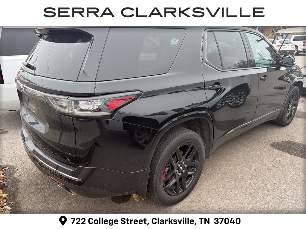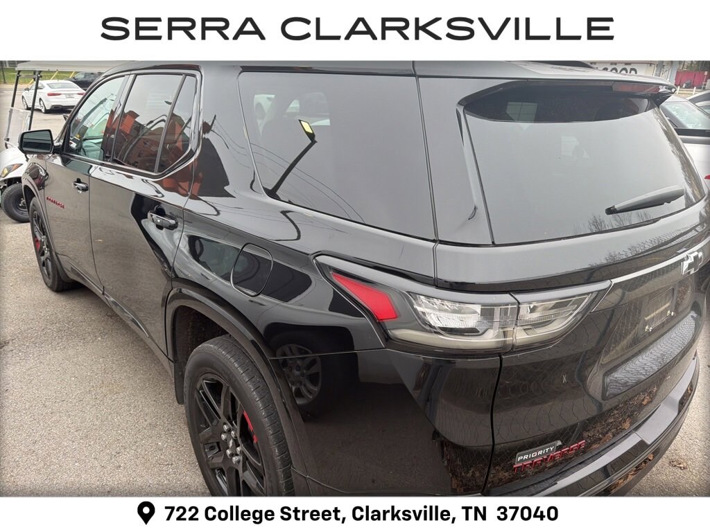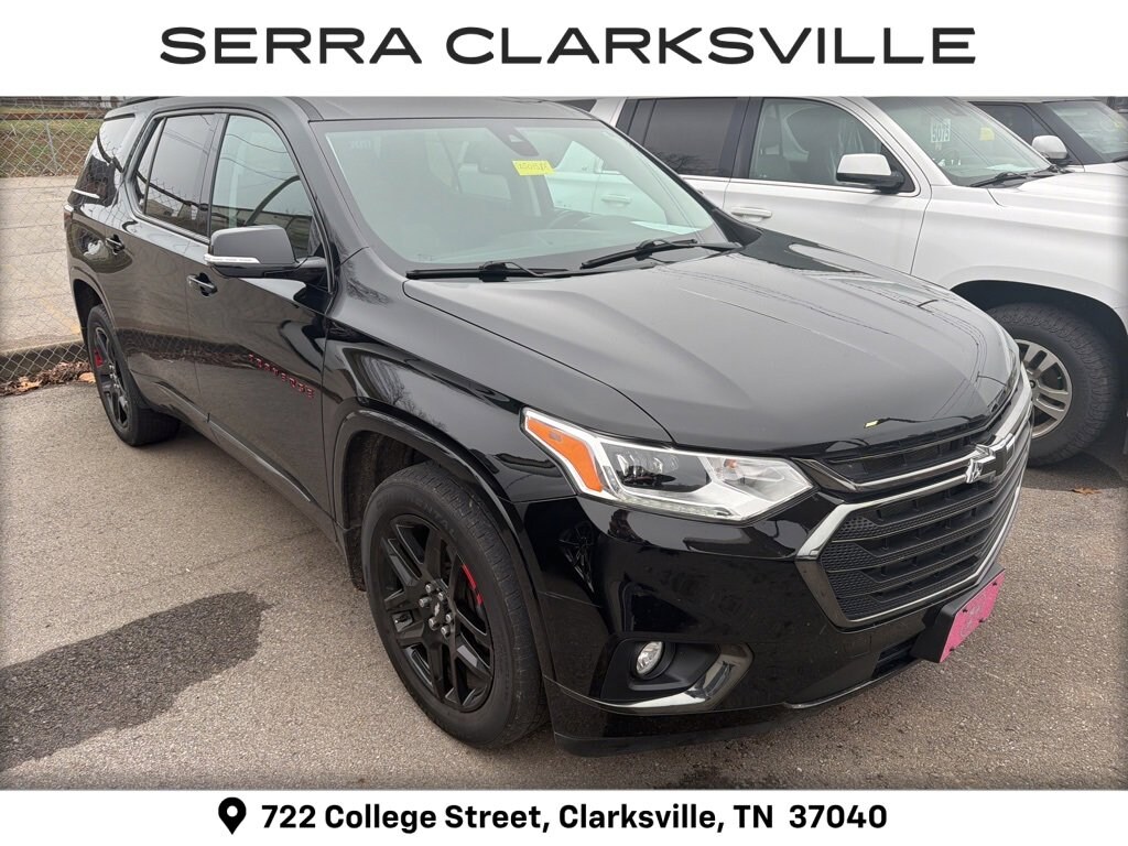 The Pre-Owned 2020 Chevrolet Traverse Premier with 3.6L V6 SIDI VVT at Serra Clarksville. Well equipped: Floor Liner Package (LPO) (1st & 2nd Row All-Weather Floor Liner (LPO), 3rd Row All-Weather Floor Liner (LPO), and Integrated Cargo Liner (LPO)), Front License Plate Bracket Mounting Package, Preferred Equipment Group 1LZ, Redline Edition (Black Door Handles, Dual SkyScape 2-Panel Power Sunroof, Ornamentation, and Wheels: 20 Gloss Black Painted Alum w/Red Stripes), Trailering Equipment (Heavy-Duty Cooling System, Hitch Guidance w/Hitch View, and Trailering Assist Guidelines), 10 Speakers, 3.49 Axle Ratio, 3rd row seats: split-bench, 4-Wheel Disc Brakes, 7-Passenger Seating (2-2-3 Seating Configuration), ABS brakes, Air Conditioning, Alloy wheels, AM/FM radio: SiriusXM, Apple CarPlay/Android Auto, Auto High-beam Headlights, Auto-dimming door mirrors, Auto-dimming Rear-View mirror, Automatic temperature control, Bose Premium 10-Speaker Audio System Feature, Brake assist, Bumpers: body-color, Compass, Delay-off headlights, Driver door bin, Driver vanity mirror, Dual front impact airbags, Dual front side impact airbags, Electronic Stability Control, Emergency communication system: OnStar and Chevrolet connected services capable, Four wheel independent suspension, Front anti-roll bar, Front Bucket Seats, Front Center Armrest, Front dual zone A/C, Front fog lights, Front reading lights, Fully automatic headlights, Garage door transmitter, Heated door mirrors, Heated front seats, Heated rear seats, Heated steering wheel, Illuminated entry, Leather steering wheel, Low tire pressure warning, Memory seat, Navigation System, Occupant sensing airbag, Outside temperature display, Overhead airbag, Overhead console, Painted Body-Color Front/Rear Splash Guards (LPO), Panic alarm, Passenger door bin, Passenger vanity mirror, Perforated Leather-Appointed Seat Trim, Power door mirrors, Power driver seat, Power Liftgate, Power passenger seat, Power steering, Power windows, Premium audio system: Chevrolet MyLink, Radio data system, Radio: Chevrolet Infotainment 3 Premium System, Rear air conditioning, Rear anti-roll bar, Rear reading lights, Rear window defroster, Rear window wiper, Remote keyless entry, Roof rack: rails only, Security system, SiriusXM w/360L, Speed control, Speed-sensing steering, Spoiler, Steering wheel memory, Steering wheel mounted audio controls, Tachometer, Telescoping steering wheel, Tilt steering wheel, Traction control, Trip computer, Turn signal indicator mirrors, Variably intermittent wipers, Ventilated front seats, Voltmeter, and Wheels: 20 Argent Metallic Machine Faced Aluminum.