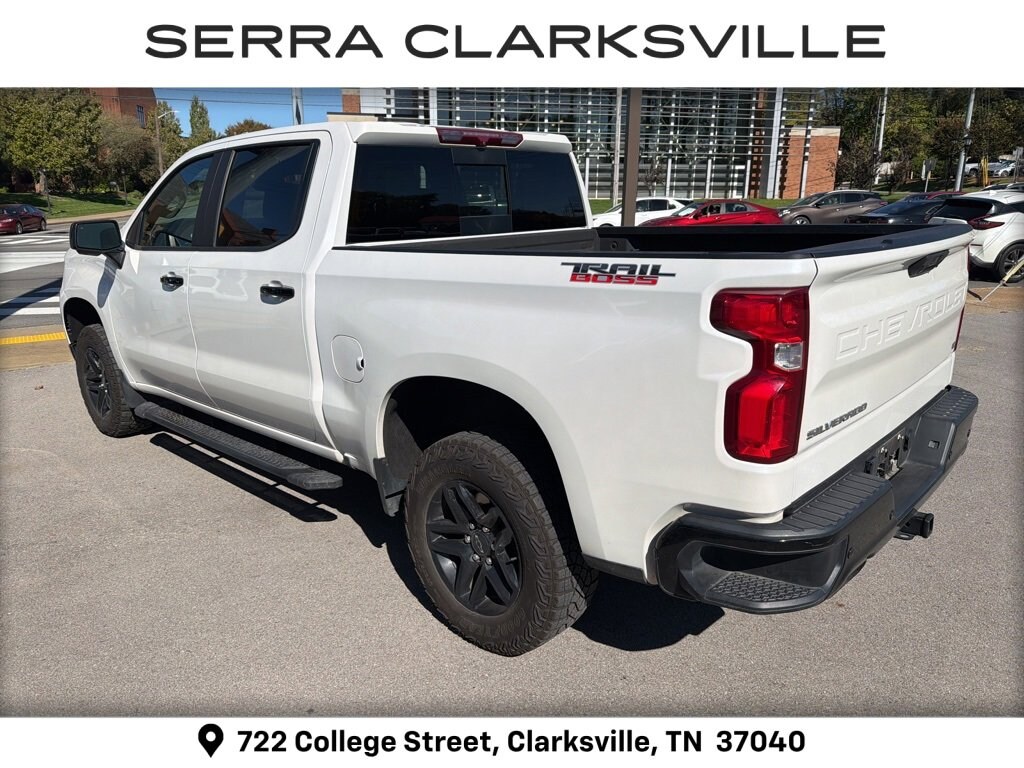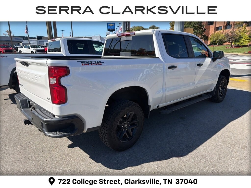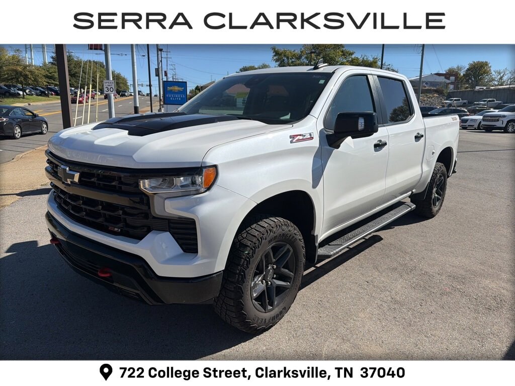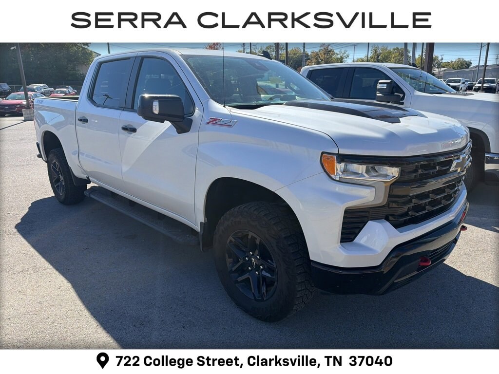 Clean CARFAX. Iridescent Pearl Tricoat 2023 Chevrolet Silverado 1500 LT Trail BossThe Pre-Owned 2023 Chevrolet Silverado 1500 LT Trail Boss with EcoTec3 5.3L V8 at Serra Clarksville. Well equipped: Convenience Package (10-Way Power Driver Seat w/Lumbar, 120-Volt Bed Mounted Power Outlet, 120-Volt Instrument Panel Power Outlet, Dual Rear USB Ports (Charge Only), Dual-Zone Automatic Climate Control, Electric Rear-Window Defogger, Heated Driver & Front Outboard Passenger Seats, Heated Steering Wheel, Keyless Open & Start, Remote Vehicle Starter System, Theft Deterrent System (Unauthorized Entry), and Wrapped Steering Wheel), Convenience Package II (Hitch Guidance w/Hitch View, Integrated Trailer Brake Controller, Power Sliding Rear Window w/Rear Defogger, Premium Bose 7-Speaker Sound System, Trailering App, and Universal Home Remote), Leather Package (Leather-Appointed Front Seat Trim), LT Trail Boss Premium Package (Power Tailgate), Preferred Equipment Group 2LT (12.3 Multicolor Reconfigurable Digital Display, 6-Speaker Audio System, All-Weather Floor Liner (LPO) (AAK), Auto-Locking Rear Differential, Bluetooth® For Phone, Chevrolet Connected Access Capable, Color-Keyed Carpeting Floor Covering, Compass, Deep-Tinted Glass, Electrical Steering Column Lock, Electronic Cruise Control, EZ Lift Power Lock & Release Tailgate, Front LED Fog Lamps, HD Rear Vision Camera, Heated Power-Adjustable Outside Mirrors, High Gloss Black Mirror Caps, Inside Rear-View Mirror w/Tilt, LED Cargo Area Lighting, OnStar & Chevrolet Connected Services Capable, Performance Red Recovery Hooks, Power Front Windows w/Driver Express Up/Down, Power Front Windows w/Passenger Express Down, Power Rear Windows w/Express Down, Rear 60/40 Folding Bench Seat (Folds Up), SiriusXM w/360L, Standard Tailgate, Steering Wheel Audio Controls, Wi-Fi Hot Spot Capable, and Wireless Phone Projection), Protection Package (Chevytec Spray-On Black Bedliner and Rear Wheelhouse Liners), Safety Package (HD Surround Vision, Perimeter Lighting, Rear Cross Traffic Alert-Braking, Rear Park Assist, Rear Pedestrian Alert, Trailer Camera Provisions, and Trailer Side Blind Zone Alert), Suspension Package (Heavy-Duty Air Filter and Hill Descent Control), Trailering Package (Hitch Guidance), Up-Level Rear Seat w/Storage Package, 10-Speed Automatic, 4WD, Black Leather, 170 Amp Alternator, 2 USB Data Ports, 220 Amp Alternator, 4-Wheel Disc Brakes, 40/20/40 Front Split-Bench Seat, 6 Speakers, ABS brakes, Air Conditioning, Alloy wheels, AM/FM radio: SiriusXM with 360L, Apple CarPlay/Android Auto, Auto High-beam Headlights, Automatic Emergency Braking, Automatic temperature control, Auxiliary External Transmission Oil Cooler, Bed View Camera, Brake assist, Cloth Seat Trim, Delay-off headlights, Driver door bin, Driver vanity mirror, Dual Exhaust w/Polished Outlets, Dual front impact airbags, Dual front side impact airbags, Electronic Stability Control, Electronic Transmission Range Selector Shifter, External Engine Oil Cooler, Floor Mounted Center Console, Following Distance Indicator, Forward Collision Alert, Front anti-roll bar, Front Bucket Seats, Front Center Armrest w/Storage, Front dual zone A/C, Front fog lights, Front License Plate Kit, Front Pedestrian Braking, Front reading lights, Front wheel independent suspension, Fully automatic headlights, Heated door mirrors, Heated front seats, Heated steering wheel, Illuminated entry, IntelliBeam Automatic High Beam On/Off, Lane Keep Assist w/Lane Departure Warning, Low tire pressure warning, Not Equipped w/Steering Column Lock, Occupant sensing airbag, Outside temperature display, Overhead airbag, Overhead console, Panic alarm, Passenger door bin, Passenger vanity mirror, Power door mirrors, Power driver seat, Power steering, Power Sunroof, Power windows, Premium audio system: Chevrolet Infotainment 3 Premium, Radio data system, Radio: Chevrolet Infotainment 3 Premium System, Rear reading lights, Rear step bumper, Rear window defroster,