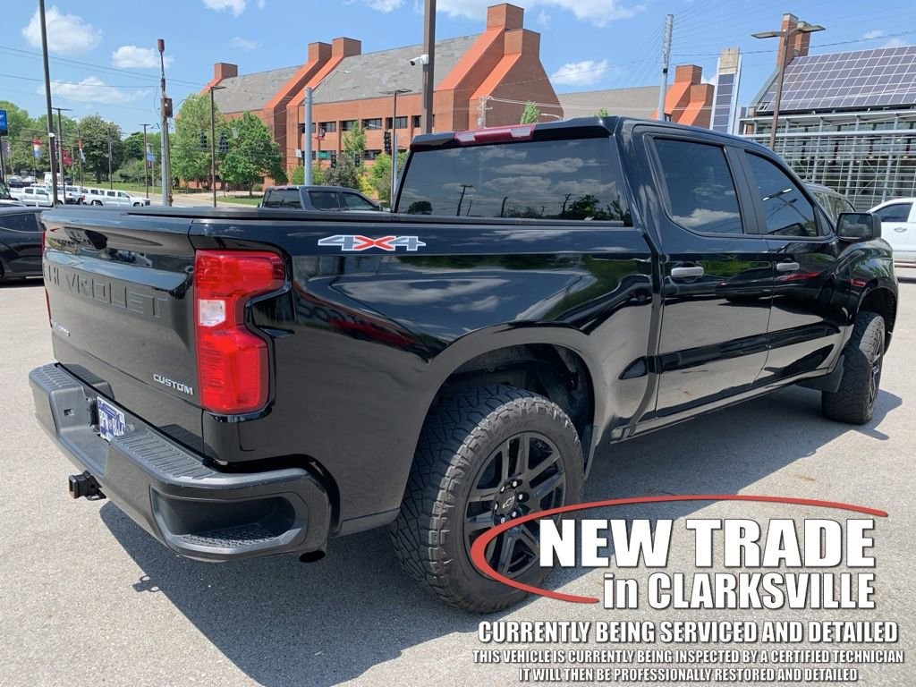 The Pre-Owned 2023 Chevrolet Silverado 1500 Custom with 2.7L Turbo at Serra Clarksville. Well equipped: Custom Convenience Package (Electric Rear-Window Defogger, EZ Lift Power Lock & Release Tailgate, LED Cargo Area Lighting, Remote Vehicle Starter System, and Theft Deterrent System (Unauthorized Entry)), Custom Value Package, High Capacity Suspension Package, Preferred Equipment Group 1CX (10-Way Power Driver Seat w/Lumbar, 120-Volt Bed Mounted Power Outlet, 120-Volt Instrument Panel Power Outlet, 3.5 Monochromatic Display Driver Info Center, Bluetooth® For Phone, Chevrolet Connected Access Capable, Color-Keyed Carpeting Floor Covering, Compass, Deep-Tinted Glass, Dual Rear USB Ports (Charge Only), Electrical Steering Column Lock, Electronic Cruise Control, Front Frame-Mounted Black Recovery Hooks, Front Rubberized Vinyl Floor Mats, HD Rear Vision Camera, Manual Tilt Wheel Steering Column, OnStar & Chevrolet Connected Services Capable, Power Front Windows w/Driver Express Up/Down, Power Front Windows w/Passenger Express Down, Power Rear Windows w/Express Down, Rear 60/40 Folding Bench Seat (Folds Up), Rear Rubberized-Vinyl Floor Mats, Remote Keyless Entry, SiriusXM Radio, Standard Tailgate, Wi-Fi Hot Spot Capable, and Wireless Phone Projection), Trailering Package (Hitch Guidance), 8-Speed Automatic, 4WD, Jet Black Cloth, 3.42 Rear Axle Ratio, 4-Wheel Disc Brakes, 40/20/40 Front Split-Bench Seat, 6 Speakers, 6-Speaker Audio System, ABS brakes, Air Conditioning, Alloy wheels, AM/FM radio: SiriusXM, Apple CarPlay/Android Auto, Auto High-beam Headlights, Automatic Emergency Braking, Brake assist, Bumpers: body-color, Cloth Seat Trim, Delay-off headlights, Driver door bin, Driver vanity mirror, Dual front impact airbags, Dual front side impact airbags, Electronic Stability Control, Following Distance Indicator, Forward Collision Alert, Front anti-roll bar, Front Black Bowtie Emblem (LPO), Front Center Armrest w/Storage, Front Pedestrian Braking, Front reading lights, Front wheel independent suspension, Fully automatic headlights, Heated door mirrors, Illuminated entry, IntelliBeam Automatic High Beam On/Off, Lane Keep Assist w/Lane Departure Warning, Low tire pressure warning, Not Equipped w/Rear USB Ports, Not Equipped w/Steering Column Lock, Occupant sensing airbag, Outside temperature display, Overhead airbag, Overhead console, Panic alarm, Passenger door bin, Passenger vanity mirror, Power door mirrors, Power driver seat, Power steering, Power windows, Premium audio system: Chevrolet Infotainment 3, Radio data system, Radio: Chevrolet Infotainment 3 System, Rear reading lights, Rear step bumper, Rear window defroster, Remote keyless entry, Security system, Speed control, Speed-sensing steering, Split folding rear seat, Tachometer, Tilt steering wheel, Traction control, Trip computer, Variably intermittent wipers, Voltmeter, Wheels: 20 x 9 Bright Silver Painted Aluminum, and Wheels: 20 x 9 High Gloss Black Painted Alum.