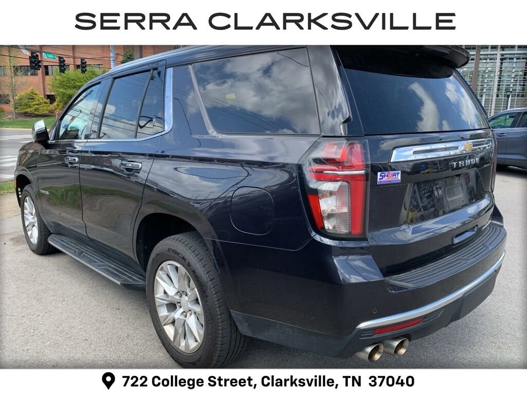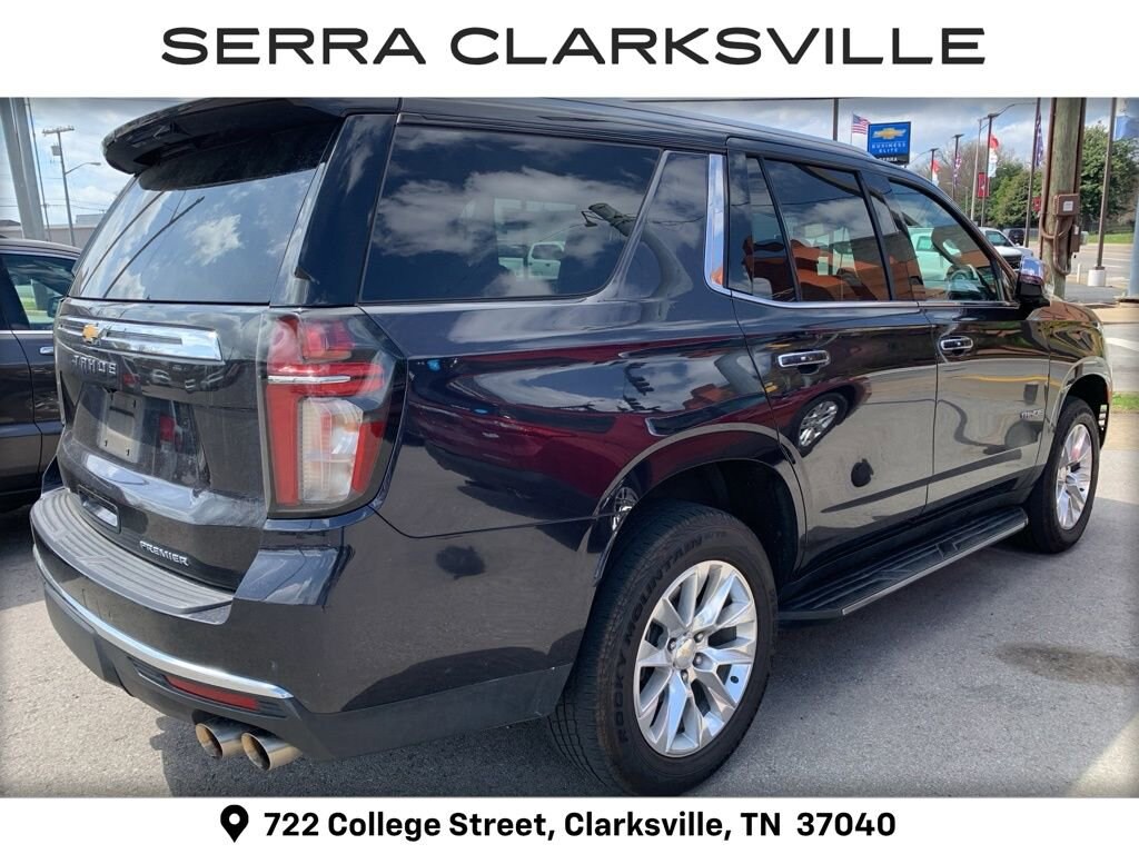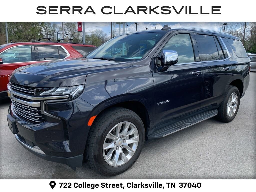 The Pre-Owned 2023 Chevrolet Tahoe Premier with EcoTec3 5.3L V8 at Serra Clarksville. Well equipped: License Plate Front Mounting Package, Preferred Equipment Group 1LZ (1st & 2nd Row Color-Keyed Carpeted Floor Mats, 3rd Row 60/40 Power-Folding Split-Bench Seat, Auto-Dimming Inside Rear-View Mirror, Bose 10-Speaker Centerpoint Surround Audio Sys Ft, Bright Front & Rear Door Sill Plates, Chrome Door Handles w/Body-Color Strip, Chrome Mirror Caps, Color-Keyed Carpeting Floor Covering, Driver & Front Outboard Passenger Airbags, Dual Exhaust System, Enhanced Driver Information Center, Floor Console, Hands-Free Rear Power Programmable Liftgate, Heated 2nd Row Outboard Seats, Heated Steering Wheel, Infotainment Display, Lane Change Alert w/Side Blind Zone Alert, LED Daytime Running Lamps, Memory Settings, Outside Heated Power-Adjustable Mirrors, Power Release 2nd Row Bucket Seats, Power Tilt & Telescopic Steering Column, Rear Cross Traffic Alert, Remote Start, Safety Alert Seat, SiriusXM Radio w/360L, Universal Home Remote, Wireless Charging, and Wrapped Steering Wheel), Jet Black Leather, 10 Speakers, 20 x 9 Polished Aluminum Wheels, 3.23 Rear Axle Ratio, 3rd row seats: split-bench, 4-Wheel Disc Brakes, ABS brakes, Adaptive suspension, Air Conditioning, Alloy wheels, AM/FM radio: SiriusXM with 360L, Apple CarPlay/Android Auto, Auto High-beam Headlights, Auto-dimming door mirrors, Auto-dimming Rear-View mirror, Auto-leveling suspension, Automatic temperature control, Brake assist, Bumpers: body-color, Compass, Delay-off headlights, Driver door bin, Driver vanity mirror, Dual front impact airbags, Dual front side impact airbags, Electronic Stability Control, Emergency communication system: OnStar and Chevrolet connected services capable, Four wheel independent suspension, Front anti-roll bar, Front Bucket Seats, Front Center Armrest, Front dual zone A/C, Front High-Back Reclining Bucket Seats, Front reading lights, Fully automatic headlights, Garage door transmitter, Heated & Ventilated Driver & Front Passenger Seats, Heated door mirrors, Heated Driver & Front Passenger Seats, Heated front seats, Heated rear seats, Heated steering wheel, Illuminated entry, Low tire pressure warning, Magnetic Ride Control Suspension, Memory seat, Navigation System, Not Equipped w/4-Way Driver & Fr Pass Pwr Lumbar, Occupant sensing airbag, Outside temperature display, Overhead airbag, Overhead console, Panic alarm, Passenger door bin, Passenger vanity mirror, Perforated Leather Seat Trim, Power door mirrors, Power driver seat, Power Liftgate, Power passenger seat, Power steering, Power windows, Premium audio system: Chevrolet Infotainment 3 Premium, Radio: Chevrolet Infotainment 3 Premium System, Rain sensing wipers, Rear air conditioning, Rear anti-roll bar, Rear reading lights, Rear window defroster, Rear window wiper, Remote keyless entry, Roof rack: rails only, Security system, Speed control, Speed-sensing steering, Split folding rear seat, Spoiler, Steering wheel memory, Steering wheel mounted audio controls, Tachometer, Telescoping steering wheel, Tilt steering wheel, Traction control, Trip computer, Turn signal indicator mirrors, Variably intermittent wipers, Ventilated front seats, and Voltmeter.