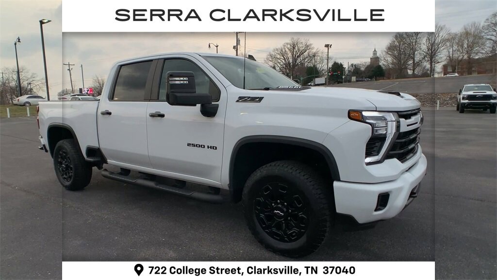 The Pre-Owned 2024 Chevrolet Silverado 2500HD LT with 6.6L V8 at Serra Clarksville. Well equipped: All Star Edition, Convenience Package (10-Way Power Driver Seat Adjuster w/Lumbar, 120-Volt Bed Mounted Power Outlet, Dual Rear USB Ports (Charge Only), Dual-Zone Automatic Climate Control, Front LED Fog Lamps, LED Cargo Area Lighting, and Manual Tilt & Telescoping Steering Column), Heat Package (Heated Driver & Front Outboard Passenger Seating and Heated Steering Wheel), Preferred Equipment Group 1LT (170 Amp Alternator, 2-Speed Electronic Shift Transfer Case, 4-Way Manual Driver Seat Adjuster, Black Mirror Caps, Bluetooth® For Phone, Chevrolet Connected Access Capable, Color-Keyed Carpeting Floor Covering, Compass, Deep-Tinted Glass, Electronic Cruise Control w/Set & Resume Speed, EZ Lift Power Lock & Release Tailgate, Front Rubberized Vinyl Floor Mats, Halogen Reflector Headlamps, HD Rear Vision Camera, Heated Vertical Trailering Mirrors, Keyless Open & Start, Manual Tilt-Wheel Steering Column, OnStar & Chevrolet Connected Services Capable, Power Door Locks, Power Front Windows w/Driver Express Up/Down, Power Front Windows w/Passenger Express Down, Power Rear Windows w/Express Down, Push Button Start, Rear 60/40 Folding Bench Seat (Folds Up), Rear Rubberized Vinyl Floor Mats, SiriusXM w/360L, Standard Tailgate, Steering Wheel Audio Controls, Wi-Fi Hotspot Capable, Wireless Phone Projection, and Wrapped Steering Wheel), Remote Start Package (Electric Rear-Window Defogger, Remote Vehicle Starter System, and Unauthorized Entry Theft-Deterrent System), Safety Package (Bed View Camera w/2 Trailer Camera Provisions, HD Surround Vision, In-Vehicle Trailering App System, Rear Cross Traffic Alert, Rear Park Assist, Trailer Camera Provisions, and Trailer Side Blind Zone Alert), Suspension Package, Z71 Off-Road Package (Hill Descent Control and Off-Road Suspension), 10-Speed Automatic, 4WD, Black Cloth, 120-Volt Interior Power Outlet (DISC), 17 Machined Aluminum Wheels, 3.73 Rear Axle Ratio, 4-Wheel Disc Brakes, 4 Round Black Assist Steps (LPO), 6 Speakers, 6-Speaker Audio System, 720 Cold-Cranking Amps Heavy-Duty Battery, ABS brakes, Air Conditioning, Alloy wheels, AM/FM radio: SiriusXM with 360L, Animated LED Projector Headlamps, Apple CarPlay/Android Auto, Auto High-beam Headlights, Auto-Dimming Inside Rear-View Mirror, Black Chevytec Spray-On Bedliner, Brake assist, Bumpers: chrome, Cloth Seat Trim, Delay-off headlights, Driver door bin, Driver vanity mirror, Dual front impact airbags, Dual front side impact airbags, Durabed Pickup Bed, Electronic Stability Control, Front 40/20/40 Split-Bench Seats w/Lockable Storage, Front anti-roll bar, Front Center Armrest w/Storage, Front reading lights, Front wheel independent suspension, Fully automatic headlights, Gloss Black Front Bumper, Gloss Black Rear Bumper, Heated & Auto-Dimming Vertical Trailering Mirrors, Heated door mirrors, High Gloss Black Mirror Caps, Illuminated entry, Low tire pressure warning, Occupant sensing airbag, Outside temperature display, Overhead airbag, Overhead console, Panic alarm, Passenger door bin, Passenger vanity mirror, Power door mirrors, Power steering, Power windows, Premium audio system: Chevrolet Infotainment 3 Premium, Radio: Chevrolet Infotainment 3 Premium System, Rear reading lights, Rear step bumper, Rear Wheelhouse Liners, Remote keyless entry, Speed control, Split folding rear seat, Steering wheel mounted audio controls, Tachometer, Tilt steering wheel, Traction control, Trip computer, Turn signal indicator mirrors, Variably intermittent wipers, Voltmeter, and Wheels: 20 High Gloss Blk Paint w/Blk Center Caps.