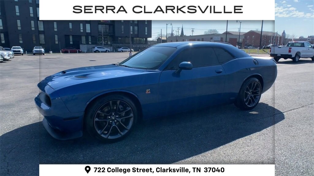 Frostbite 2021 Dodge Challenger R/T Scat PackThe Pre-Owned 2021 Dodge Challenger R/T Scat Pack with SRT HEMI 6.4L V8 at Serra Clarksville. Well equipped: Quick Order Package 23G R/T Scat Pack, 1-Yr SiriusXM Guardian Trial, 230MM Rear Axle, 4-Wheel Disc Brakes, 6 Speakers, ABS brakes, Air Conditioning, Alloy wheels, AM/FM radio: SiriusXM, Anti-whiplash front head restraints, Apple CarPlay, Apple CarPlay/Android Auto, Auto-dimming Rear-View mirror, Automatic temperature control, Brake assist, Bumpers: body-color, Compass, Delay-off headlights, Driver door bin, Driver vanity mirror, Dual front impact airbags, Dual front side impact airbags, Electronic Stability Control, Emergency communication system: SiriusXM Guardian, Four wheel independent suspension, Front anti-roll bar, Front Bucket Seats, Front Center Armrest, Front dual zone A/C, Front fog lights, Front reading lights, Fully automatic headlights, Garage door transmitter, Google Android Auto, GPS Antenna Input, Heated door mirrors, Heated front seats, Heated steering wheel, Illuminated entry, Integrated Center Stack Radio, Integrated Voice Command w/Bluetooth, Leather Shift Knob, Low tire pressure warning, Media Hub (2 USB, AUX), Outside temperature display, Overhead airbag, Overhead console, Panic alarm, ParkView Rear Back-Up Camera, Passenger door bin, Passenger vanity mirror, Power door mirrors, Power driver seat, Power steering, Power windows, Radio data system, Radio: Uconnect 4C w/8.4 Display, Rear anti-roll bar, Rear reading lights, Rear seat center armrest, Rear window defroster, Remote keyless entry, Scat Pack Logo Houndstooth Seat, Security system, Shark Fin Antenna, SiriusXM Satellite Radio, Speed control, Speed-sensing steering, Split folding rear seat, Spoiler, Sport steering wheel, Steering wheel mounted audio controls, Tachometer, Telescoping steering wheel, Tilt steering wheel, Traction control, Trip computer, USB Host Flip, Variably intermittent wipers, and Wheels: 20 x 9 Lo Gloss Granite Crystal.RWD SRT HEMI 6.4L V8 Tremec 6-Speed ManualRecent Arrival!