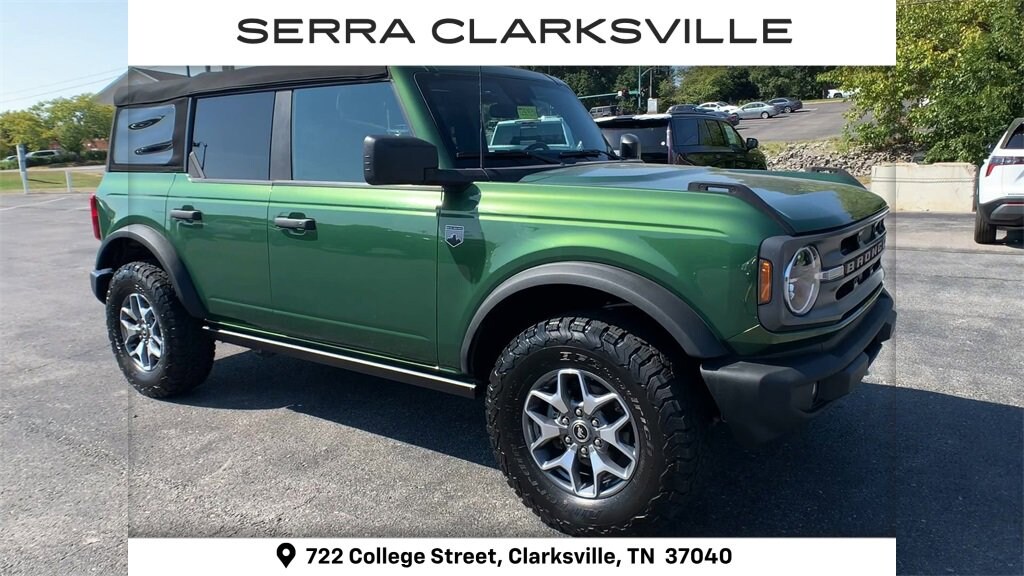 Local new car trade-in! The Pre-Owned 2022 Ford Bronco Big Bend with 2.7L EcoBoost V6 at Serra Clarksville. Well equipped: Equipment Group 222A Mid Package (2-Door Intelligent Access w/Lock/Unlock, Ambient Footwell Lighting, Auto-Dimming Interior Rear-View Mirror, Connected Navigation, Dr & Pass Illuminated Sliding Visor Vanity Mirrors, Dual-Zone Electronic Automatic Temperature Control, Enhanced Voice Recognition, Front Row Heated Seats, Power Outlet - Back Side of Center Floor Console, Rear Parking Sensors, and Remote Start System), 3.73 Axle Ratio, 4-Wheel Disc Brakes, 4.46 Axle Ratio, 6 Speakers, ABS brakes, Air Conditioning, Alloy wheels, AM/FM radio: SiriusXM with 360L, AM/FM Stereo, Auto High-Beam Headlamps, Auto High-beam Headlights, BLIS Blind Spot Information System, Brake assist, Cloth Bucket Seats, Compass, Delay-off headlights, Driver door bin, Driver vanity mirror, Dual front impact airbags, Dual front side impact airbags, Electronic Stability Control, Emergency communication system: 911 Assist, Exterior Parking Camera Rear, Front & Rear Floor Liners w/o Carpet Floor Mats, Front anti-roll bar, Front Bucket Seats, Front Center Armrest, Front fog lights, Front reading lights, Front wheel independent suspension, Fully automatic headlights, Heated door mirrors, Illuminated entry, Integrated roll-over protection, Lane-Keeping System, Leather Shift Knob, Low tire pressure warning, Occupant sensing airbag, Outside temperature display, Overhead airbag, Overhead console, Panic alarm, Passenger door bin, Passenger vanity mirror, Power door mirrors, Power steering, Power windows, Pre-Collision Assist w/Automatic Emergency Braking, Radio data system, Rear-View Camera, Remote keyless entry, Security system, SiriusXM Radio w/360L, Speed control, Split folding rear seat, Steering wheel mounted audio controls, SYNC 4, Tachometer, Telescoping steering wheel, Tilt steering wheel, Towing Capability, Traction control, Trip computer, Variably intermittent wipers, and Wheels: 17 Carbonized Gray-Painted Aluminum.