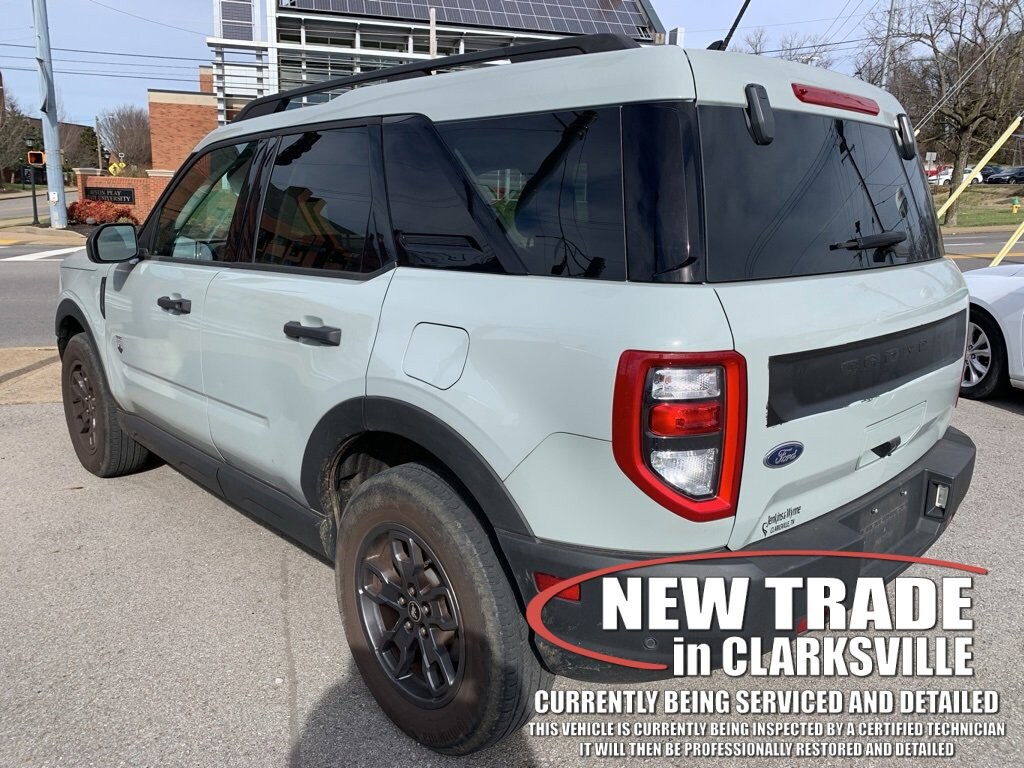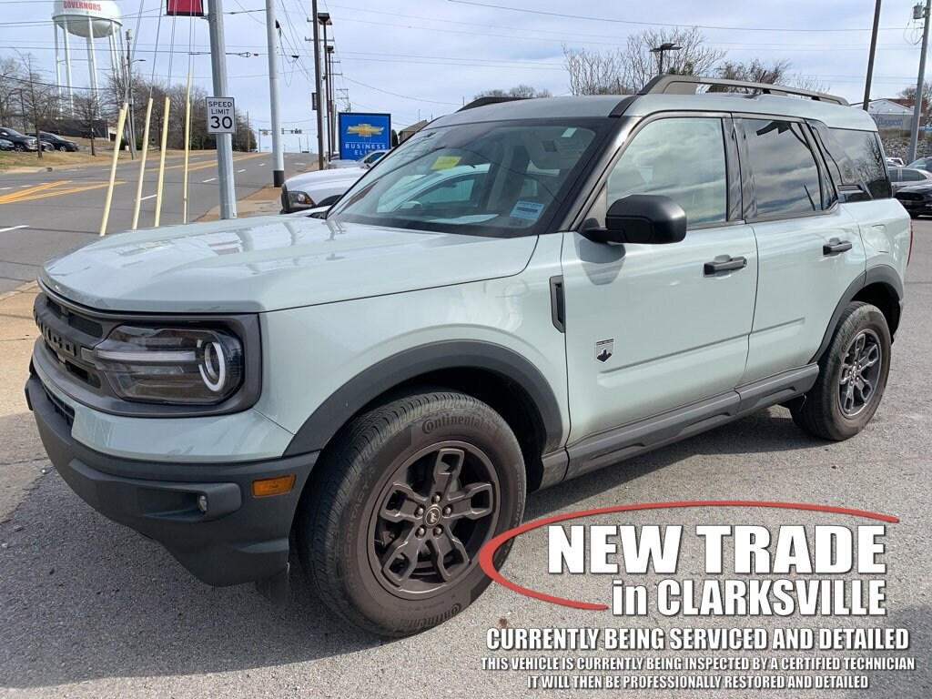 CARFAX One-Owner. Cactus Gray 2022 Ford Bronco Sport Big BendThe Pre-Owned 2022 Ford Bronco Sport Big Bend with 1.5L EcoBoost at Serra Clarksville. Well equipped: Convenience Package (Front Driver & Passenger Seatback Zipper Pockets, Heated Front Bucket Seats, Intelligent Access (Lock/Unlock), Leather-Wrapped Steering Wheel, LED Fog Lamps, Rear Parking Sensors, Universal Garage Door Opener (UGDO), and Wireless Charging Pad), Equipment Group 200A, 3.80 Axle Ratio, 4-Wheel Disc Brakes, 4G LTE Wi-Fi Hotspot Credit, 6 Speakers, ABS brakes, Air Conditioning, Alloy wheels, AM/FM radio: SiriusXM, AM/FM Stereo, Auto High-beam Headlights, Automatic temperature control, Brake assist, Compass, Delay-off headlights, Driver door bin, Driver vanity mirror, Dual front impact airbags, Dual front side impact airbags, Electronic Stability Control, Emergency communication system: SYNC 3 911 Assist, Four wheel independent suspension, Front anti-roll bar, Front Bucket Seats, Front Center Armrest, Front reading lights, Fully automatic headlights, Heated door mirrors, Illuminated entry, Knee airbag, Low tire pressure warning, Occupant sensing airbag, Outside temperature display, Overhead airbag, Overhead console, Panic alarm, Passenger door bin, Passenger vanity mirror, Power door mirrors, Power steering, Power windows, Radio data system, Rear anti-roll bar, Rear reading lights, Rear seat center armrest, Rear window defroster, Rear window wiper, Remote keyless entry, Roof rack: rails only, Security system, SiriusXM Radio, Speed control, Speed-sensing steering, Speed-Sensitive Wipers, Split folding rear seat, Steering wheel mounted audio controls, SYNC 3 Communications & Entertainment System, SYNC 3/Apple CarPlay/Android Auto, Tachometer, Telescoping steering wheel, Tilt steering wheel, Traction control, Trip computer, Unique Cloth Front Bucket Seats, Variably intermittent wipers, and Wheels: 17 Carbonized Gray-Painted Aluminum.4WD 1.5L EcoBoost 8-Speed AutomaticRecent Arrival! Odometer is 21002 miles below market average! 25/28 City/Highway MPG
