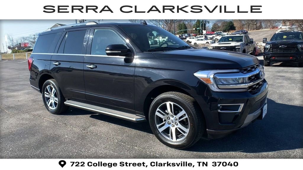The Pre-Owned 2023 Ford Expedition Limited with EcoBoost 3.5L V6 GTDi DOHC 24V Twin Turbocharged at Serra Clarksville. Well equipped: Equipment Group 301A Mid Package (Panoramic Vista Roof), 4WD, 12 Speakers, 3.31 Axle Ratio, 3rd row seats: split-bench, 4-Wheel Disc Brakes, ABS brakes, Adjustable pedals, Air Conditioning, Alloy wheels, AM/FM radio: SiriusXM with 360L, Auto High-beam Headlights, Auto-dimming door mirrors, Auto-dimming Rear-View mirror, Automatic temperature control, Brake assist, Bumpers: body-color, Compass, Delay-off headlights, Driver door bin, Driver vanity mirror, Dual front impact airbags, Dual front side impact airbags, Electronic Stability Control, Emergency communication system: SYNC 4 911 Assist, Exterior Parking Camera Rear, Four wheel independent suspension, Front anti-roll bar, Front Bucket Seats, Front Center Armrest, Front dual zone A/C, Front fog lights, Front License Plate Bracket, Front reading lights, Fully automatic headlights, Garage door transmitter, Heated & Ventilated Leather Front Captain's Chairs, Heated door mirrors, Heated front seats, Heated rear seats, Heated steering wheel, Illuminated entry, Leather steering wheel, Low tire pressure warning, Memory seat, Navigation system: Connected Navigation, Occupant sensing airbag, Outside temperature display, Overhead airbag, Overhead console, Panic alarm, Passenger door bin, Passenger vanity mirror, Pedal memory, Power door mirrors, Power driver seat, Power Liftgate, Power moonroof, Power passenger seat, Power steering, Power windows, Radio data system, Radio: B&O Sound System by Bang & Olufsen, Rain sensing wipers, Rear air conditioning, Rear anti-roll bar, Rear reading lights, Rear window defroster, Rear window wiper, Reclining 3rd row seat, Remote keyless entry, Second Row Power Windows Removal, Security system, SiriusXM w/360L, Speed control, Speed-sensing steering, Speed-Sensitive Wipers, Split folding rear seat, Spoiler, Steering wheel memory, Steering wheel mounted audio controls, SYNC 4 w/Enhanced Voice Recognition, Tachometer, Telescoping steering wheel, Tilt steering wheel, Traction control, Trip computer, Turn signal indicator mirrors, Variably intermittent wipers, Ventilated front seats, Voltmeter, and Wheels: 20 Bright Machined Aluminum.