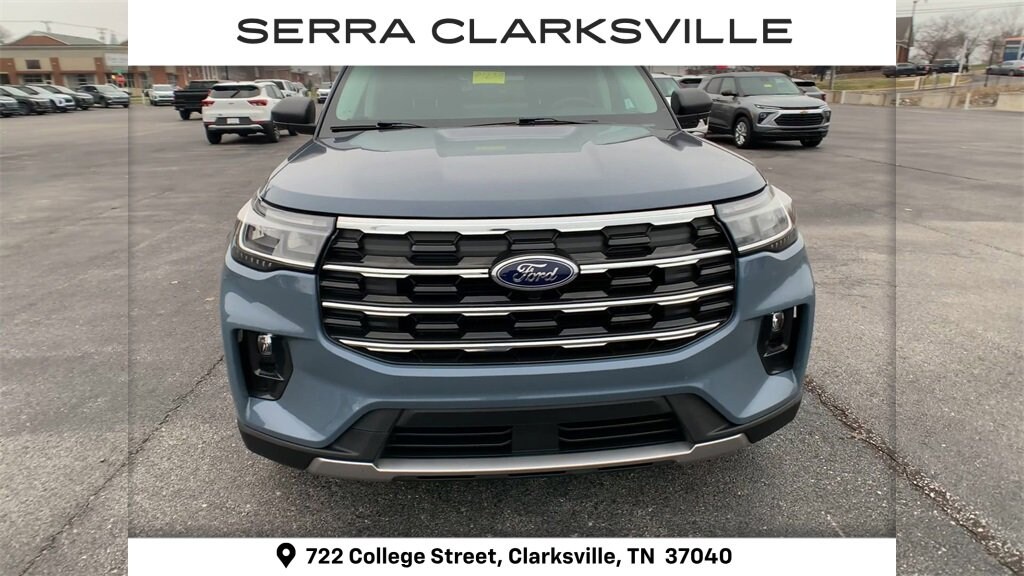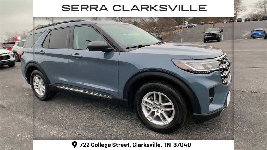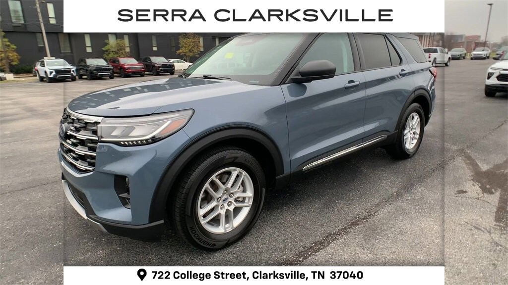 The Pre-Owned 2025 Ford Explorer Active with 2.3L EcoBoost I-4 at Serra Clarksville. Well equipped: Active Comfort Package (Front Fascia, Heated ActiveX Seating Material Captain's Chairs, Heated Steering Wheel, Remote Start System, Second Row HVAC Controls, and Universal Garage Door Opener (UGDO)), Equipment Group 200A Standard Package, 3.58 Non-Limited Slip Rear Axle, 3rd row seats: bench, 4-Wheel Disc Brakes, 6 Speakers, ABS brakes, Air Conditioning, Alloy wheels, AM/FM radio: SiriusXM with 360L, AM/FM Stereo, Apple CarPlay/Android Auto, Auto High-beam Headlights, Automatic temperature control, Brake assist, Bumpers: body-color, Compass, Delay-off headlights, Driver door bin, Driver vanity mirror, Dual front impact airbags, Dual front side impact airbags, Electronic Stability Control, Emergency communication system: 911 Assist, Exterior Parking Camera Rear, Four wheel independent suspension, Front anti-roll bar, Front Bucket Seats, Front Center Armrest, Front dual zone A/C, Front reading lights, Fully automatic headlights, Heated door mirrors, Heated front seats, Illuminated entry, Knee airbag, Leather steering wheel, Low tire pressure warning, Navigation System, Occupant sensing airbag, Outside temperature display, Overhead airbag, Overhead console, Panic alarm, Passenger door bin, Passenger vanity mirror, Power door mirrors, Power driver seat, Power Liftgate, Power passenger seat, Power steering, Power windows, Rear air conditioning, Rear anti-roll bar, Rear reading lights, Rear window defroster, Rear window wiper, Remote keyless entry, Security system, Speed control, Speed-sensing steering, Speed-Sensitive Wipers, Split folding rear seat, Spoiler, Steering wheel mounted audio controls, Tachometer, Telescoping steering wheel, Tilt steering wheel, Traction control, Trip computer, Unique Heated Cloth Captain's Chairs, Variably intermittent wipers, and Wheels: 18 Sparkle Silver-Painted Aluminum.