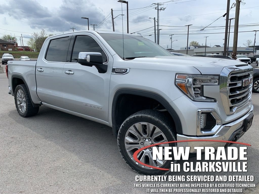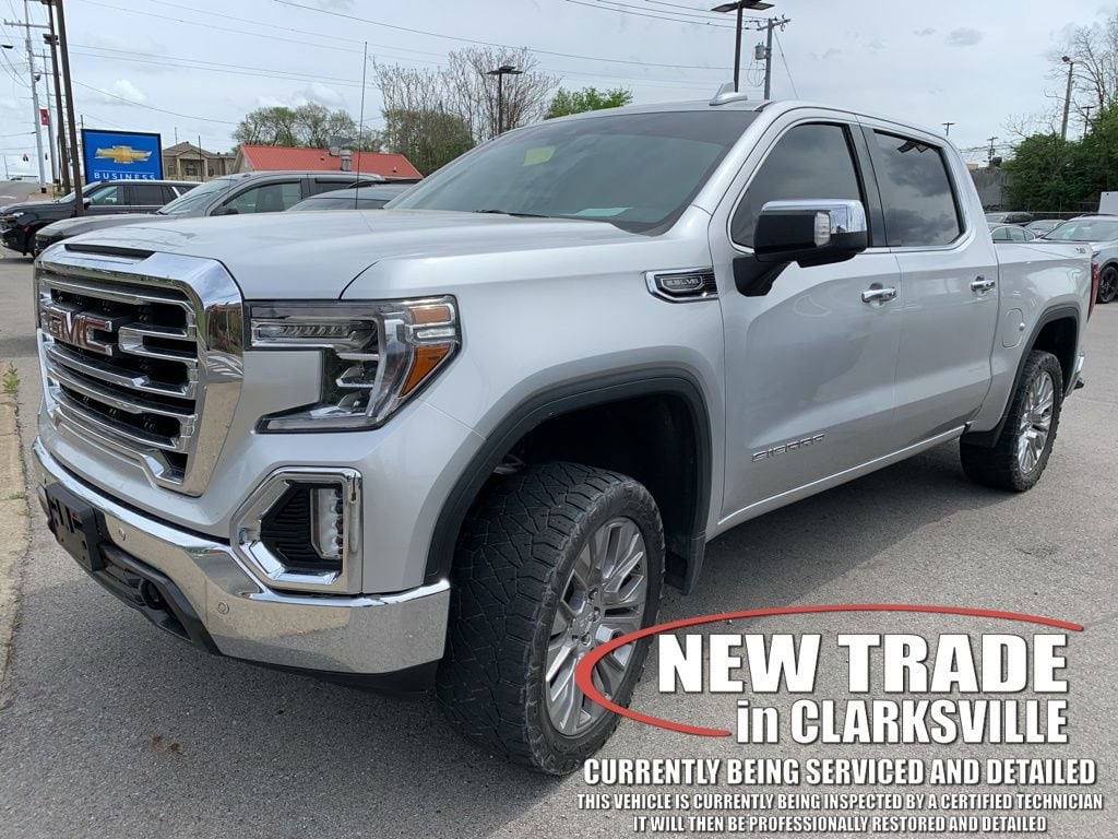 The Pre-Owned 2019 GMC Sierra 1500 SLT with EcoTec3 5.3L V8 at Serra Clarksville. Well equipped: Driver Alert Package I (Lane Change Alert w/Side Blind Zone Alert, Perimeter Lighting, Rear Cross Traffic Alert, and Ultrasonic Front & Rear Park Assist), Driver Alert Package II (Following Distance Indicator, Forward Collision Alert, Front Pedestrian Braking, IntelliBeam Automatic High Beam On/Off, Lane Keep Assist w/Lane Departure Warning, Low Speed Forward Automatic Braking, and Safety Alert Seat), Preferred Equipment Group 4SA (12-Volt Rear Auxiliary Power Outlet, 120-Volt Bed Mounted Power Outlet, 120-Volt Instrument Panel Power Outlet, 170 Amp Alternator, Auxiliary External Transmission Oil Cooler, Chrome Grille, Color-Keyed Carpeting Floor Covering, Compass, Deep-Tinted Glass, Electric Rear-Window Defogger, Electrical Lock Control Steering Column, Front Frame-Mounted Black Recovery Hooks, GMC 4G LTE, GMC Connected Access, HD Radio, Heated Driver & Front Passenger Seating, Heavy-Duty Rear Locking Differential, Hitch Guidance, Hitch Guidance w/Hitch View, In-Vehicle Trailering App, Integrated Trailer Brake Controller, Keyless Open & Start, LED Cargo Area Lighting, Manual Tilt-Wheel & Telescoping Steering Column, OnStar & GMC Connected Services Capable, Power Door Locks, Power Front Passenger Windows w/Express Up/Down, Power Front Windows w/Driver Express Up/Down, Power Rear Windows w/Express Down, Rear Dual USB Charging-Only Ports, Rear Wheelhouse Liners, Remote Vehicle Starter System, Steering Wheel Audio Controls, and Theft Deterrent System (Unauthorized Entry)), SLT Convenience Package (2 USB Ports, 2 USB Ports (1st Row), Floor Mounted Console, Front Bucket Seats, Heated 2nd Row Outboard Seats, Power Sliding Rear Window w/Rear Defogger, Universal Home Remote, and Ventilated Driver & Front Passenger Seats), SLT Preferred Package (Premium Bose 7-Speaker Sound System, Radio: Premium GMC Infotainment Sys w/Navigation, SiriusXM Radio, and Wireless Charging), SLT Premium Plus Package (Chrome Assist Steps, Spray-On Pickup Bed Liner w/GMC Logo, and Trailer Tire Pressure Monitor System), Trailering Package, X31 Off-Road Package (Dual Exhaust w/Premium Tips, High-Capacity Air Filter, Hill Descent Control, Off-Road Suspension, and X31 Hard Badge), 8-Speed Automatic, 4WD, Jet Black Leather, 10-Way Power Driver Seat Adjuster w/Lumbar, 10-Way Power Passenger Seat Adjuster w/Lumbar, 20 x 9 Polished Aluminum Wheels, 3.23 Rear Axle Ratio, 4-Wheel Disc Brakes, 6 Speakers, 6-Speaker Audio System Feature, ABS brakes, Air Conditioning, Alloy wheels, AM/FM radio: SiriusXM, Apple CarPlay/Android Auto, Auto-dimming door mirrors, Auto-dimming Rear-View mirror, Automatic temperature control, Brake assist, Bumpers: chrome, Delay-off headlights, Driver door bin, Driver Memory, Driver vanity mirror, Dual front impact airbags, Dual front side impact airbags, Electronic Stability Control, Front 40/20/40 Split-Bench Seat, Front anti-roll bar, Front Center Armrest w/Storage, Front dual zone A/C, Front fog lights, Front reading lights, Front wheel independent suspension, Fully automatic headlights, Heated door mirrors, Heated front seats, Heated steering wheel, Heavy Duty Suspension, Illuminated entry, Low tire pressure warning, Memory seat, Occupant sensing airbag, Outside temperature display, Overhead airbag, Overhead console, Panic alarm, Passenger door bin, Passenger vanity mirror, Perforated Leather-Appointed Seat Trim, Power door mirrors, Power driver seat, Power passenger seat, Power steering, Power Sunroof, Power windows, Premium audio system: GMC Infotainment System, Radio data system, Radio: Premium GMC Infotainment Sys w/Multi-Touch, Rear reading lights, Rear seat center armrest, Rear step bumper, Rear window defroster, Remote keyless entry, Security system, Speed control, Speed-sensing steering, Split folding rear seat, Steering wheel mounted a