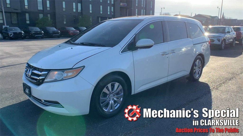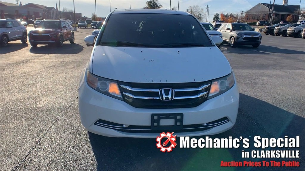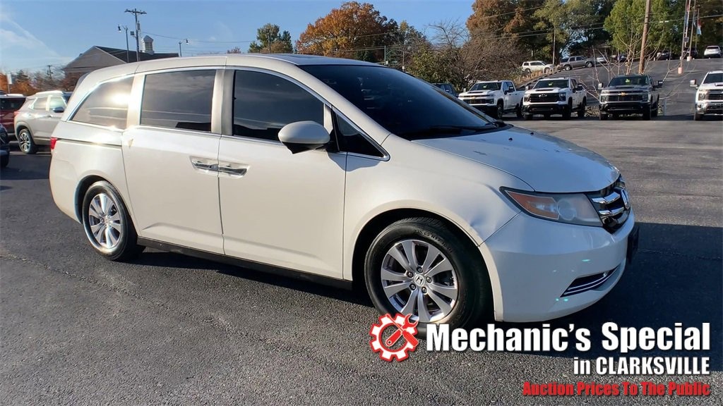 Mechanic Special. It is not perfect, but it is CHEAP! Local trade-in. The Pre-Owned 2014 Honda Odyssey EX-L with 3.5L V6 SOHC i-VTEC 24V at Serra Clarksville. Well equipped: 17 x 7 Alloy Wheels, 3rd row seats: split-bench, 4-Wheel Disc Brakes, 4.25 Axle Ratio, 7 Speakers, ABS brakes, Air Conditioning, Alloy wheels, AM/FM radio: XM, Anti-whiplash front head restraints, Auto-dimming Rear-View mirror, Automatic temperature control, Brake assist, Bumpers: body-color, CD player, Delay-off headlights, Driver door bin, Driver vanity mirror, Driver's Seat Mounted Armrest, Dual front impact airbags, Dual front side impact airbags, Electronic Stability Control, Exterior Parking Camera Rear, Four wheel independent suspension, Front anti-roll bar, Front Bucket Seats, Front dual zone A/C, Front reading lights, Fully automatic headlights, Garage door transmitter: HomeLink, Heated door mirrors, Heated Front Bucket Seats, Heated front seats, Illuminated entry, Leather Seat Trim, Leather Shift Knob, Leather steering wheel, Low tire pressure warning, Occupant sensing airbag, Outside temperature display, Overhead airbag, Overhead console, Panic alarm, Passenger door bin, Passenger seat mounted armrest, Passenger vanity mirror, Power door mirrors, Power driver seat, Power Liftgate, Power moonroof, Power passenger seat, Power steering, Power windows, Radio data system, Rear air conditioning, Rear reading lights, Rear seat center armrest, Rear window defroster, Rear window wiper, Reclining 3rd row seat, Remote keyless entry, Security system, Speed control, Speed-sensing steering, Speed-Sensitive Wipers, Split folding rear seat, Spoiler, Steering wheel mounted audio controls, Tachometer, Telescoping steering wheel, Tilt steering wheel, Traction control, Trip computer, and Variably intermittent wipers.