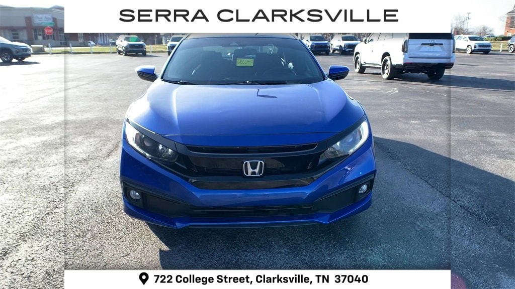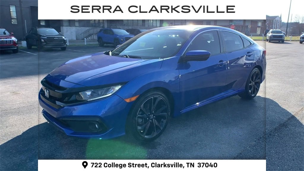 The Pre-Owned 2020 Honda Civic Sport with 2.0L I4 DOHC 16V i-VTEC at Serra Clarksville. Well equipped: Black Cloth, 4-Wheel Disc Brakes, 8 Speakers, ABS brakes, Adaptive Cruise Control: Adaptive Cruise Control (ACC) with Low-Speed Follow, Air Conditioning, Alloy wheels, AM/FM radio, Apple CarPlay/Android Auto, Auto High-beam Headlights, Automatic temperature control, Brake assist, Bumpers: body-color, Cloth Seat Trim, Delay-off headlights, Driver door bin, Driver vanity mirror, Dual front impact airbags, Dual front side impact airbags, Electronic Stability Control, Emergency communication system: HondaLink, Exterior Parking Camera Rear, Forward collision: Collision Mitigation Braking System (CMBS) + FCW mitigation, Four wheel independent suspension, Front anti-roll bar, Front Bucket Seats, Front Center Armrest, Front fog lights, Front reading lights, Fully automatic headlights, Illuminated entry, Lane departure: Lane Keeping Assist System (LKAS) active, Leather Shift Knob, Low tire pressure warning, Occupant sensing airbag, Outside temperature display, Overhead airbag, Panic alarm, Passenger door bin, Passenger vanity mirror, Power door mirrors, Power steering, Power windows, Radio data system, Radio: 180-Watt AM/FM Audio System, Rear anti-roll bar, Rear window defroster, Remote keyless entry, Security system, Speed control, Speed-sensing steering, Split folding rear seat, Spoiler, Steering wheel mounted audio controls, Tachometer, Telescoping steering wheel, Tilt steering wheel, Traction control, Trip computer, and Wheels: 18 Alloy w/Gloss Black Inserts.
