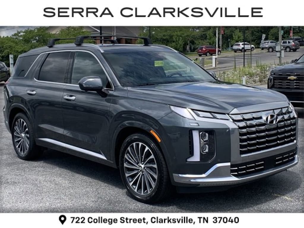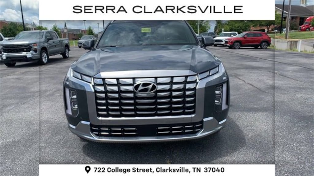 Local trade-in! Clean CARFAX. The Pre-Owned 2023 Hyundai Palisade Calligraphy with V6 at Serra Clarksville. Well equipped: Option Group 01, 12 Speakers, 3.510 Axle Ratio, 3rd row seats: split-bench, 4-Wheel Disc Brakes, ABS brakes, Air Conditioning, Alloy wheels, AM/FM radio: SiriusXM, Apple CarPlay & Android Auto, Auto High-beam Headlights, Auto-dimming door mirrors, Auto-dimming Rear-View mirror, Auto-leveling suspension, Automatic temperature control, Brake assist, Bumpers: body-color, Cargo Net, Carpeted Floor Mats, Compass, Delay-off headlights, Driver door bin, Driver vanity mirror, Dual front impact airbags, Dual front side impact airbags, Electronic Stability Control, Emergency communication system: Blue Link Connected Car Service (3-year complimentary subscription), Exterior Parking Camera Rear, First Aid Kit, Four wheel independent suspension, Front anti-roll bar, Front Bucket Seats, Front Center Armrest, Front dual zone A/C, Front reading lights, Fully automatic headlights, Garage door transmitter: HomeLink, harman/kardon® Speakers, Heads-Up Display, Heated & Ventilated Front Bucket Seats, Heated door mirrors, Heated front seats, Heated rear seats, Heated steering wheel, Illuminated entry, Knee airbag, Low tire pressure warning, Memory seat, Navigation System, Occupant sensing airbag, Outside temperature display, Overhead airbag, Overhead console, Panic alarm, Passenger door bin, Passenger vanity mirror, Power door mirrors, Power driver seat, Power Liftgate, Power moonroof, Power passenger seat, Power steering, Power windows, Premium Nappa Leather Seat Trim, Radio data system, Radio: AM/FM/MP3 Premium Audio System, Rain sensing wipers, Rear air conditioning, Rear anti-roll bar, Rear audio controls, Rear reading lights, Rear side impact airbag, Rear window defroster, Rear window wiper, Reclining 3rd row seat, Remote keyless entry, Security system, Speed control, Speed-sensing steering, Split folding rear seat, Spoiler, Steering wheel mounted audio controls, Tachometer, Telescoping steering wheel, Tilt steering wheel, Traction control, Trip computer, Turn signal indicator mirrors, Variably intermittent wipers, Ventilated front seats, Ventilated rear seats, and Wheels: 20 x 7.5J Calligraphy Exclusive Alloy.