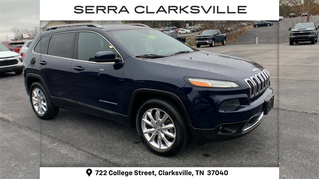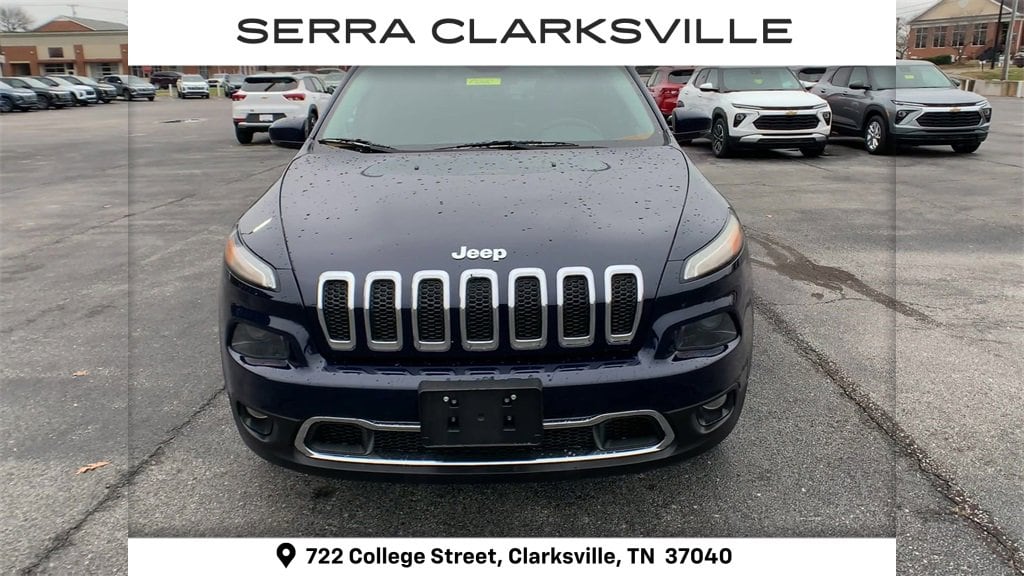 Local trade-in! The Pre-Owned 2015 Jeep Cherokee Limited with 2.4L I4 PZEV MultiAir at Serra Clarksville. Well equipped: Quick Order Package 24G, 3.73 Axle Ratio, 4-Wheel Disc Brakes, 6 Speakers, 8.4 Touch Screen Display, ABS brakes, Active Grille Shutters, Air Conditioning, Alloy wheels, AM/FM radio: SiriusXM, Anti-whiplash front head restraints, Auto-dimming Rear-View mirror, Automatic temperature control, Auxiliary Transmission Oil Cooler, Brake assist, Bumpers: body-color, Compass, Delay-off headlights, Driver door bin, Driver vanity mirror, Dual front impact airbags, Dual front side impact airbags, Electronic Stability Control, Emergency communication system, Engine Oil Cooler, Four wheel independent suspension, Front anti-roll bar, Front Bucket Seats, Front Center Armrest, Front dual zone A/C, Front fog lights, Front reading lights, Fully automatic headlights, Garage door transmitter, GPS Antenna Input, Harman Radio Manufacturer, Heated door mirrors, Heated front seats, Heated steering wheel, Illuminated entry, Integrated Voice Command w/Bluetooth, Knee airbag, Leather Shift Knob, Leather Trimmed Bucket Seats, Low tire pressure warning, Manufacturer's Statement of Origin, Normal Duty Suspension, Occupant sensing airbag, Outside temperature display, Overhead airbag, Overhead console, Panic alarm, ParkView Rear Back-Up Camera, Passenger door bin, Passenger vanity mirror, Power door mirrors, Power driver seat, Power steering, Power windows, Radio data system, Radio: Uconnect 8.4A AM/FM/SXM/BT, Rear anti-roll bar, Rear reading lights, Rear seat center armrest, Rear side impact airbag, Rear window defroster, Rear window wiper, Remote keyless entry, Roof rack: rails only, Security system, Speed control, Speed-sensing steering, Split folding rear seat, Spoiler, Steering wheel mounted audio controls, Tachometer, Telescoping steering wheel, Tilt steering wheel, Traction control, Trip computer, Turn signal indicator mirrors, Uconnect Access, Variably intermittent wipers, Voltmeter, and Wheels: 18 x 7 Polished Aluminum.