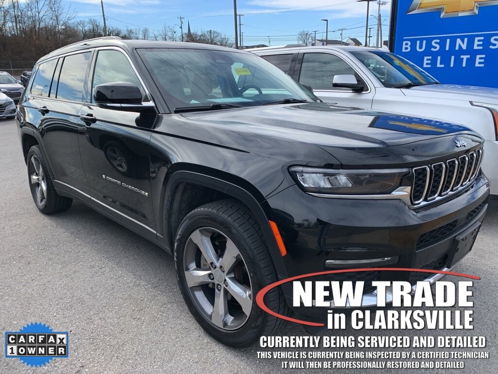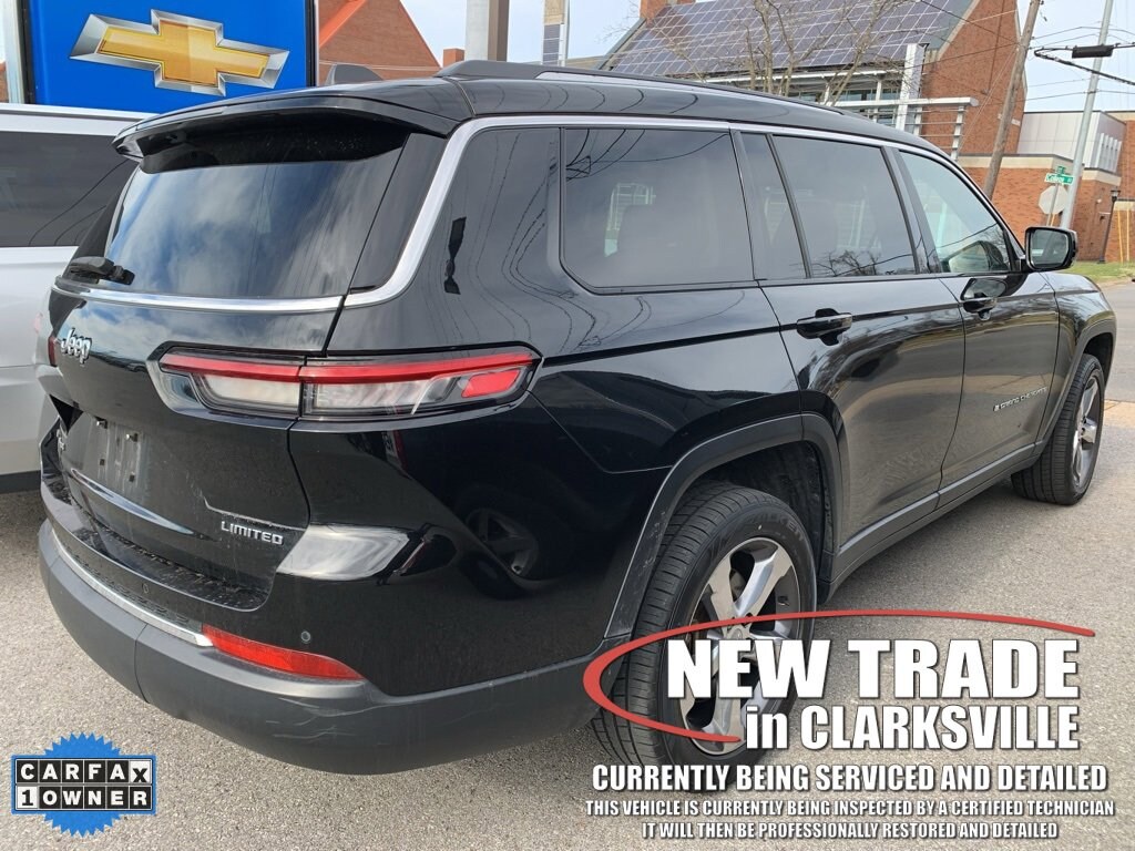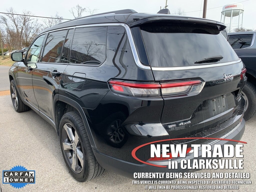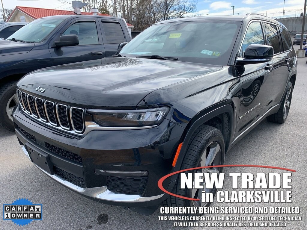 The Pre-Owned 2021 Jeep Grand Cherokee L Limited with 3.6L V6 24V VVT at Serra Clarksville. Well equipped: Quick Order Package 22E, Trailer Tow Group (B) (DISC) (220 Amp Alternator, Automatic Headlamp Leveling System, Heavy-Duty Engine Cooling, Rear Load Leveling Suspension, and Trailer Hitch Zoom), 10.1 Touchscreen Display, 3.45 Rear Axle Ratio, 3rd row seats: split-bench, 4-Wheel Disc Brakes, 506 Watt Amplifier, 6 Speakers, 9 Amplified Speakers w/Subwoofer, ABS brakes, Air Conditioning, Alloy wheels, AM/FM radio: SiriusXM w/360L, Anti-whiplash front head restraints, Apple CarPlay, Apple CarPlay/Android Auto, Audio memory, Auto High-beam Headlights, Automatic temperature control, Brake assist, Bridgestone Brand Tires, Bumpers: body-color, Capri Leather Seats, Compass, Connected Travel & Traffic Services, Connectivity - US/Canada, Delay-off headlights, Disassociated Touchscreen Display, Driver door bin, Driver vanity mirror, Dual front impact airbags, Dual front side impact airbags, Dual-Pane Panoramic Sunroof, Electronic Stability Control, Emergency communication system, Four wheel independent suspension, Front anti-roll bar, Front Bucket Seats, Front Center Armrest w/Storage, Front dual zone A/C, Front fog lights, Front reading lights, Fully automatic headlights, Garage door transmitter, Google Android Auto, GPS Antenna Input, GPS Navigation, HD Radio, Heated door mirrors, Heated front seats, Heated rear seats, Heated steering wheel, Illuminated entry, Integrated Center Stack Radio, Integrated Voice Command w/Bluetooth, Interior Rear Facing Camera, Knee airbag, Leather steering wheel, Low tire pressure warning, Manual Fold Seatbacks, Memory seat, Normal Duty Suspension, Occupant sensing airbag, Outside temperature display, Overhead airbag, Overhead console, Panic alarm, ParkView Rear Back-Up Camera, Passenger door bin, Passenger vanity mirror, Power door mirrors, Power driver seat, Power Liftgate, Power passenger seat, Power steering, Power windows, Radio data system, Radio: Uconnect 5 Nav w/10.1 Display, Radio: Uconnect 5 w/8.4 Display, Rear air conditioning, Rear anti-roll bar, Rear reading lights, Rear window defroster, Rear window wiper, Reclining 3rd row seat, Remote keyless entry, Roof rack: rails only, Security system, SiriusXM Satellite Radio, SiriusXM w/360L, Speed control, Speed-Sensitive Wipers, Split folding rear seat, Spoiler, Steering wheel mounted audio controls, Tachometer, Telescoping steering wheel, Tilt steering wheel, Traction control, Trip computer, Turn signal indicator mirrors, USB Host Flip, Variably intermittent wipers, Voltmeter, Wheels: 18 x 8.0 Fully Painted Aluminum 2, and Wheels: 20 x 8.5 Polished/Painted Aluminum (DISC)