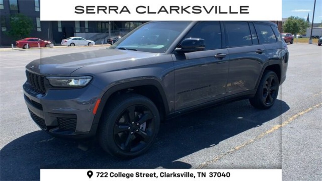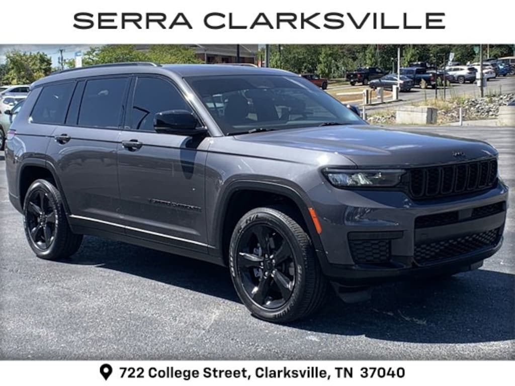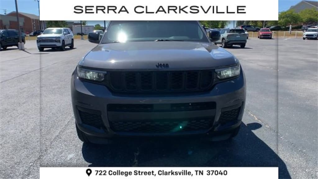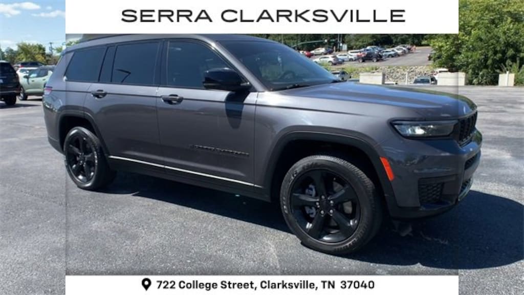 One-owner local new car trade-in! Clean CARFAX. The Pre-Owned 2023 Jeep Grand Cherokee L Altitude with 3.6L V6 24V VVT at Serra Clarksville. Well equipped: Altitude Appearance Package, Quick Order Package 23B Altitude (115V Auxiliary Power Outlet, 3rd Row Charge-Only USB Ports, Black Headliner, Capri Leatherette/Suede Seats, Delete Laredo Badge, Gloss Black Exterior Accents, Heated Front Seats, Heated Steering Wheel, Molded In Color Black/Gloss Black Roof Rails, Power Liftgate, Rain Sensitive Windshield Wipers, Remote Start System, Selectable Tire Fill Alert, Wheels: 18 x 8.0 Fully Painted Aluminum 1, and Wireless Charging Pad), 3.45 Rear Axle Ratio, 3rd row seats: split-bench, 4-Wheel Disc Brakes, 6 Speakers, ABS brakes, Air Conditioning, Alloy wheels, Anti-whiplash front head restraints, Automatic temperature control, Brake assist, Bumpers: body-color, Cloth Seats, Compass, Delay-off headlights, Driver door bin, Driver vanity mirror, Dual front impact airbags, Dual front side impact airbags, Electronic Stability Control, Emergency communication system, Four wheel independent suspension, Front anti-roll bar, Front Bucket Seats, Front Center Armrest w/Storage, Front dual zone A/C, Front reading lights, Fully automatic headlights, Heated door mirrors, Illuminated entry, Knee airbag, Low tire pressure warning, Manual Fold Seatbacks, Normal Duty Suspension, Occupant sensing airbag, Outside temperature display, Overhead airbag, Overhead console, Panic alarm, ParkView Rear Back-Up Camera, Passenger door bin, Passenger vanity mirror, Power door mirrors, Power driver seat, Power steering, Power Sunroof (DISC), Power windows, Radio data system, Radio: Uconnect 5 w/8.4 Display, Rear air conditioning, Rear anti-roll bar, Rear reading lights, Rear window defroster, Rear window wiper, Reclining 3rd row seat, Remote keyless entry, Security system, Speed control, Speed-Sensitive Wipers, Split folding rear seat, Spoiler, Steering wheel mounted audio controls, Tachometer, Telescoping steering wheel, Tilt steering wheel, Traction control, Trip computer, Variably intermittent wipers, Voltmeter, and Wheels: 18 x 8.0 Fully Painted Aluminum.