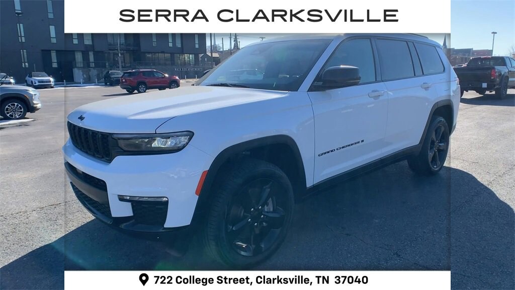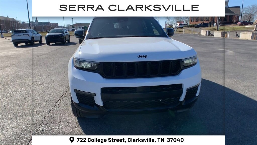 CARFAX One-Owner. Clean CARFAX. Bright White Clearcoat 2024 Jeep Grand Cherokee L LimitedThe Pre-Owned 2024 Jeep Grand Cherokee L Limited with 3.6L V6 24V VVT at Serra Clarksville. Well equipped: Black Appearance Package (Gloss Black Exterior Accents and Wheels: 20 x 8.5 Gloss Black Painted Aluminum), Quick Order Package 23E, 2nd Row 60/40 Bench w/Manual Tip/Slide, 2nd Row Seat Center Armrest/Cupholders, 3 Rear Seat Head Restraints, 3.45 Rear Axle Ratio, 3rd row seats: split-bench, 4-Wheel Disc Brakes, 506 Watt Amplifier, 6 Speakers, 7-Passenger Seating, 9 Amplified Speakers w/Subwoofer, ABS brakes, Active Noise Control System, Air Conditioning, Alloy wheels, AM/FM radio: SiriusXM with 360L, Anti-whiplash front head restraints, Audio memory, Auto High-beam Headlights, Automatic temperature control, Brake assist, Bumpers: body-color, Capri Leatherette Seats, Center Rear 3-Point Seat Belt, Compass, Delay-off headlights, Driver door bin, Driver vanity mirror, Dual front impact airbags, Dual front side impact airbags, Dual-Pane Panoramic Sunroof, Electronic Stability Control, Emergency communication system, Four wheel independent suspension, Front anti-roll bar, Front Bucket Seats, Front Center Armrest w/Storage, Front dual zone A/C, Front fog lights, Front reading lights, Fully automatic headlights, Garage door transmitter, Heated door mirrors, Heated front seats, Heated rear seats, Heated steering wheel, Illuminated entry, Interior Rear Facing Camera, Knee airbag, Low tire pressure warning, Manual Fold Seatbacks, Memory seat, Navigation System, Normal Duty Suspension, Occupant sensing airbag, Outside temperature display, Overhead airbag, Overhead console, Panic alarm, ParkView Rear Back-Up Camera, Passenger door bin, Passenger vanity mirror, Power door mirrors, Power driver seat, Power Liftgate, Power passenger seat, Power steering, Power windows, Radio data system, Radio: Uconnect 5 Nav w/10.1 Display, Rear air conditioning, Rear anti-roll bar, Rear reading lights, Rear window defroster, Rear window wiper, Reclining 3rd row seat, Remote keyless entry, Security system, Speed control, Speed-Sensitive Wipers, Split folding rear seat, Spoiler, Steering wheel mounted audio controls, Tachometer, Telescoping steering wheel, Tilt steering wheel, Traction control, Trip computer, Turn signal indicator mirrors, Variably intermittent wipers, Voltmeter, and Wheels: 18 x 8.0 Polished/Painted Aluminum.4WD 3.6L V6 24V VVT 8-Speed AutomaticOdometer is 27744 miles below market average!
