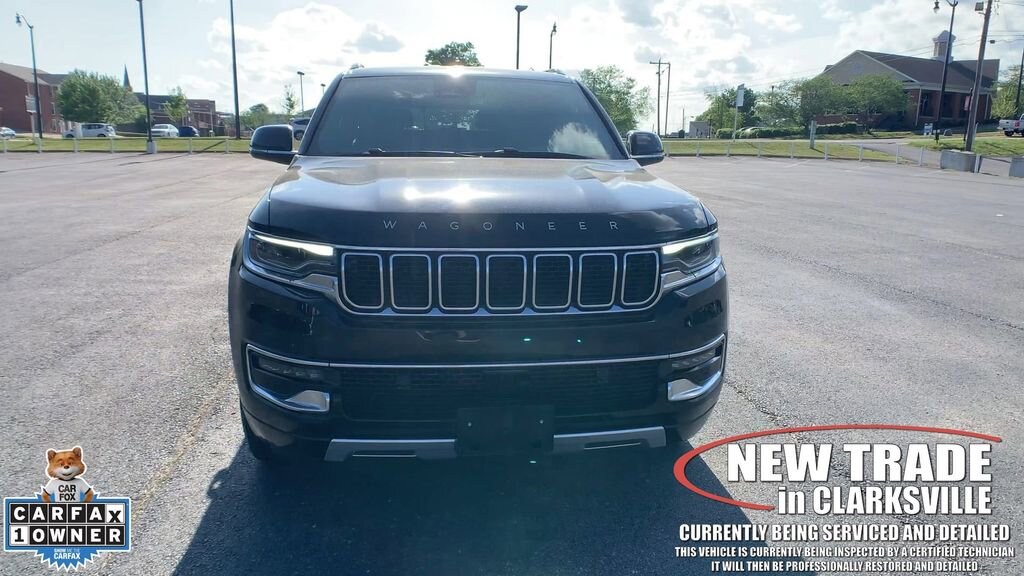 The Pre-Owned 2024 Jeep Wagoneer Series II with 3.0L I6 at Serra Clarksville. Well equipped: Quick Order Package 25J, 10 Speakers, 3.55 Rear Axle Ratio, 3rd row seats: bench, 4-Wheel Disc Brakes, 8-Passenger Seating, ABS brakes, Adjustable pedals, Air Conditioning, Alloy wheels, AM/FM radio: SiriusXM with 360L, Anti-whiplash front head restraints, Apple CarPlay/Android Auto, Audio memory, Auto-dimming door mirrors, Auto-dimming Rear-View mirror, Auto-leveling suspension, Automatic temperature control, Brake assist, Bumpers: body-color, Compass, Delay-off headlights, Driver door bin, Driver vanity mirror, Driver's Seat Mounted Armrest, Dual front impact airbags, Dual front side impact airbags, Electronic Stability Control, Emergency communication system: Wagoneer Connect, Exterior Parking Camera Rear, Four wheel independent suspension, Front anti-roll bar, Front Bucket Seats, Front Center Armrest w/Storage, Front dual zone A/C, Front fog lights, Front reading lights, Fully automatic headlights, Garage door transmitter, Genuine wood console insert, Genuine wood dashboard insert, Genuine wood door panel insert, Heated door mirrors, Heated front seats, Heated rear seats, Heated steering wheel, Illuminated entry, Knee airbag, Leather Trimmed Bucket Seats, Low tire pressure warning, Memory seat, Navigation System, Normal Duty Suspension, Occupant sensing airbag, Outside temperature display, Overhead airbag, Overhead console, Panic alarm, Passenger door bin, Passenger seat mounted armrest, Passenger vanity mirror, Pedal memory, Power adjustable front head restraints, Power door mirrors, Power driver seat, Power Liftgate, Power passenger seat, Power steering, Power windows, Radio data system, Radio: Uconnect 5 Nav w/10.1 Display, Rain sensing wipers, Rear air conditioning, Rear anti-roll bar, Rear dual zone A/C, Rear reading lights, Rear seat center armrest, Rear window defroster, Rear window wiper, Reclining 3rd row seat, Remote keyless entry, Security system, Speed control, Speed-sensing steering, Speed-Sensitive Wipers, Split folding rear seat, Steering wheel memory, Steering wheel mounted audio controls, Tachometer, Telescoping steering wheel, Tilt steering wheel, Traction control, Trip computer, Turn signal indicator mirrors, Variably intermittent wipers, Ventilated front seats, Voltmeter, and Wheels: 20 x 9.0 Premium 2 Aluminum.