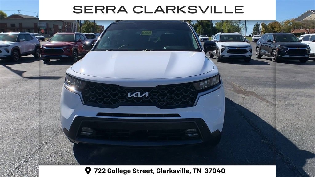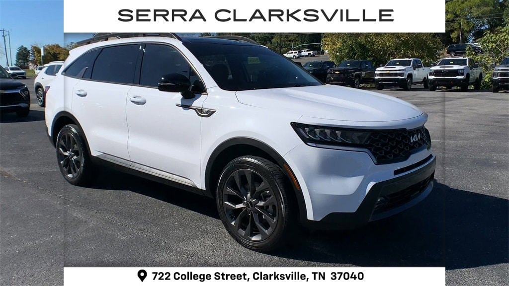 One-owner local trade-in! Clean CARFAX. The Pre-Owned 2023 Kia Sorento X-Line EX with 2.5L I4 DGI Turbocharged DOHC 16V LEV3-ULEV70 281hp at Serra Clarksville. Well equipped: AWD, 3.316 Axle Ratio, 3rd row seats: split-bench, 4-Wheel Disc Brakes, 6 Speakers, ABS brakes, Air Conditioning, Alloy wheels, AM/FM radio: SiriusXM, Apple CarPlay & Android Auto, Auto High-beam Headlights, Auto-dimming Rear-View mirror, Automatic temperature control, Brake assist, Bumpers: body-color, Carpet Floor Mats, Delay-off headlights, Driver door bin, Driver vanity mirror, Dual front impact airbags, Dual front side impact airbags, Electronic Stability Control, Emergency communication system, Exterior Parking Camera Rear, Four wheel independent suspension, Front anti-roll bar, Front Bucket Seats, Front Center Armrest, Front dual zone A/C, Front fog lights, Front reading lights, Fully automatic headlights, Heated door mirrors, Heated Front Bucket Seats, Heated front seats, Illuminated entry, Knee airbag, Leather Shift Knob, Leather steering wheel, Low tire pressure warning, Navigation System, Occupant sensing airbag, Outside temperature display, Overhead airbag, Overhead console, Panic alarm, Passenger door bin, Passenger vanity mirror, Power door mirrors, Power driver seat, Power Liftgate, Power moonroof, Power passenger seat, Power steering, Power windows, Radio data system, Radio: AM/FM Audio System, Rear air conditioning, Rear anti-roll bar, Rear reading lights, Rear window defroster, Rear window wiper, Remote keyless entry, Roof rack: rails only, Security system, Smart Key w/ Push Button and Remote Start, Speed control, Speed-sensing steering, Split folding rear seat, Spoiler, Steering wheel mounted audio controls, SynTex Artificial Leather Seat Trim, Tachometer, Telescoping steering wheel, Tilt steering wheel, Traction control, Trip computer, Turn signal indicator mirrors, Variably intermittent wipers, and Wheels: 8.5J x 20 Matte Gray Alloy.