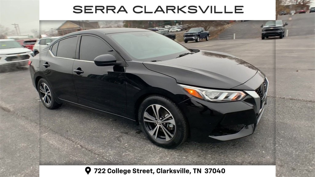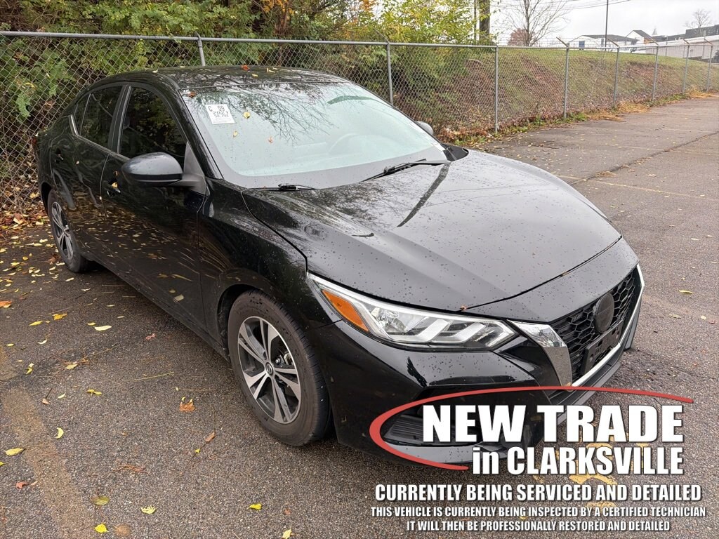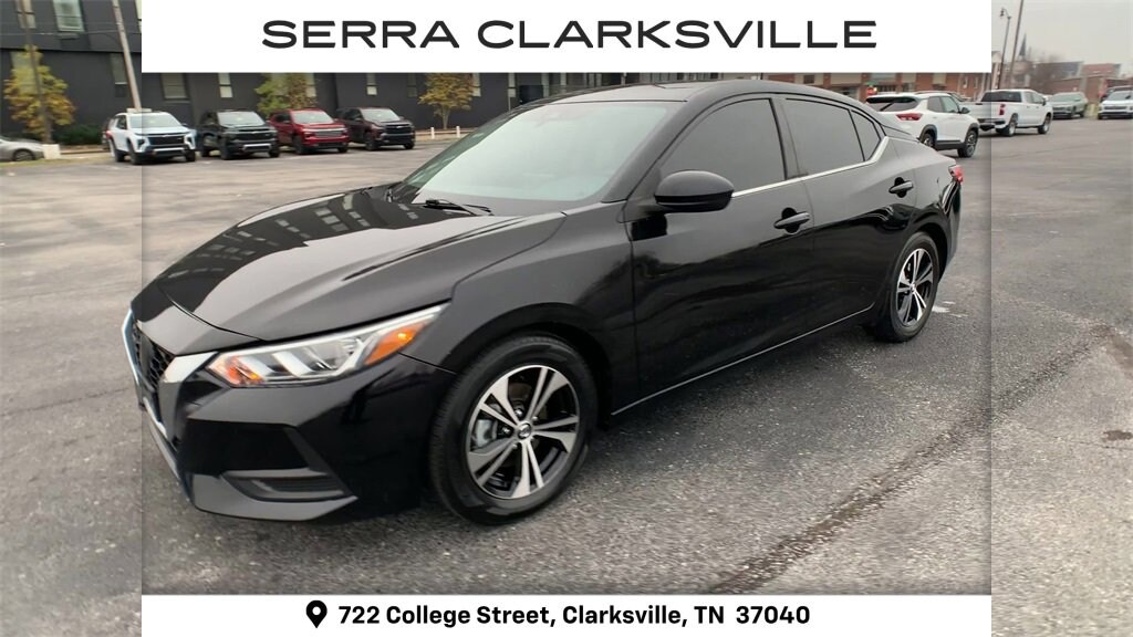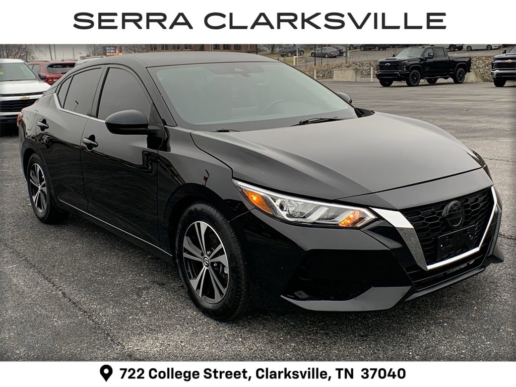 The Pre-Owned 2021 Nissan Sentra SV with 2.0L DOHC at Serra Clarksville. Well equipped: CVT with Xtronic, Charcoal Cloth, 16 Alloy Wheels, 4-Wheel Disc Brakes, 6 Speakers, ABS brakes, Air Conditioning, Alloy wheels, AM/FM radio: SiriusXM, Auto High-beam Headlights, Automatic temperature control, Blind Spot Warning, Brake assist, Bumpers: body-color, Carpeted Floor Mats w/Trunk Mat, Delay-off headlights, Driver door bin, Driver vanity mirror, Dual front impact airbags, Dual front side impact airbags, Electronic Stability Control, Four wheel independent suspension, Front anti-roll bar, Front Bucket Seats, Front Center Armrest, Front dual zone A/C, Front reading lights, Fully automatic headlights, Heated door mirrors, Illuminated entry, Knee airbag, Low tire pressure warning, NissanConnect featuring Apple CarPlay and Android Auto, Occupant sensing airbag, Outside temperature display, Overhead airbag, Overhead console, Panic alarm, Passenger door bin, Passenger vanity mirror, Power door mirrors, Power steering, Power windows, Radio data system, Radio: AM/FM w/RDS/MP3/Aux-In, Rear anti-roll bar, Rear Parking Sensors, Rear seat center armrest, Rear side impact airbag, Rear window defroster, Remote keyless entry, Security system, Speed control, Speed-sensing steering, Split folding rear seat, Steering wheel mounted audio controls, Tachometer, Telescoping steering wheel, Tilt steering wheel, Traction control, Trip computer, Upgraded Cloth Seat Trim, and Variably intermittent wipers.
