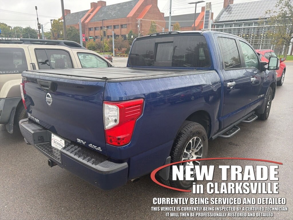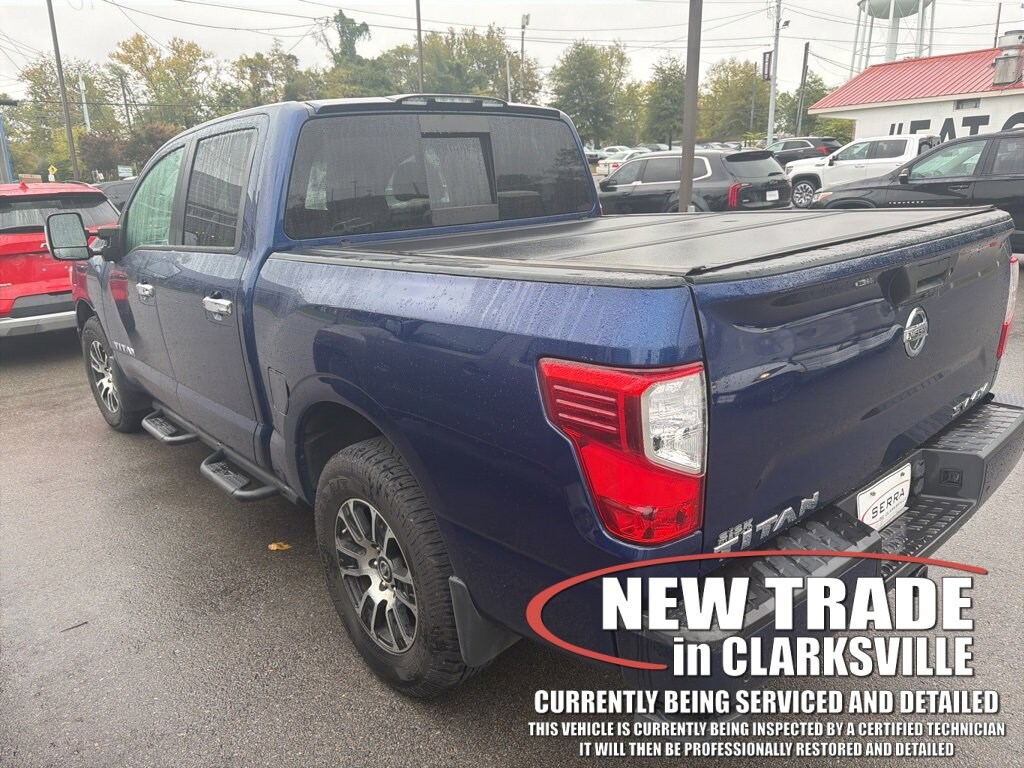 One-owner local new car trade-in! Clean CARFAX. The Pre-Owned 2021 Nissan Titan SV with 5.6L V8 DOHC 32V 400hp at Serra Clarksville. Well equipped: Off Road Protection Package (All Season Floor Mats), SV Convenience Package (110V/12V Outlets In Back Of Center Console, 2 Illuminated USB-A Ports In Back Of Center Console, Auto-Dimming Rear-View Mirror, Chrome Interior Door Locks, Convex Spotter Mirror, Dedicated Cell Phone Holder, Dual Zone Automatic HVAC, Front & Rear Parking Sensors, Heated Front Captain's Chairs, Intelligent Key System, Leather-Wrapped Steering Wheel, Power Sliding Rear Window w/Defogger, Radio: NissanConnect w/Navigation, Rear HVAC Vents, Remote Engine Start on Key Fob, and Traffic Sign Recognition (TSR)), SV Tow Package (4-Pin/7-Pin Wiring Harness Connector (Rear Bumper), Heated Manually Extendable Tow Mirrors, Puddle Lamps, Receiver Hitch, Trailer Brake Controller, and Trailer Light Check Function On Key Fob), SV Utility Package (110V Outlet in Bed, Auto-Dimming Rearview Mirror w/UGDO, Electronic Locking Tailgate, Flat Floor Function w/Tie Down Hooks, LED Tailgate Area Illumination, LED Under Rail Bed Lighting, Rain Sensing Wipers, Rear Utility Bed Step, Spray-On Bedliner, Universal Garage Door Opener, and Utilitrack System w/4 Tie-Down Cleats), 4WD, 3.692 Axle Ratio, 4-Wheel Disc Brakes, 6 Speakers, ABS brakes, Air Conditioning, Alloy wheels, AM/FM radio: SiriusXM, Auto High-beam Headlights, Blind Spot Warning, Brake assist, Bumpers: chrome, Carpet Floor Mats (L95), Cloth Seat Trim, Driver door bin, Driver vanity mirror, Dual front impact airbags, Dual front side impact airbags, Electronic Stability Control, Electronic Tailgate Lock Deletion, Emergency communication system: NissanConnect Services, Front anti-roll bar, Front Center Armrest w/Storage, Front reading lights, Front Split Bench Seat (40/20/40), Front wheel independent suspension, Fully automatic headlights, Heated door mirrors, Illuminated entry, Knee airbag, Loop Side Steps, Low tire pressure warning, NissanConnect featuring Apple CarPlay and Android Auto, Occupant sensing airbag, Outside temperature display, Overhead airbag, Overhead console, Panic alarm, Passenger door bin, Passenger vanity mirror, Power door mirrors, Power steering, Power windows, Radio data system, Radio: NissanConnect AM/FM, Rear anti-roll bar, Rear Bumper Step w/Electronic Tailgate Lock, Rear Parking Sensors, Rear seat center armrest, Rear step bumper, Rear window defroster, Remote keyless entry, Security system, Speed control, Speed-sensing steering, Speed-Sensitive Wipers, Splash Guards, Split folding rear seat, Steering wheel mounted audio controls, Tachometer, Telescoping steering wheel, Tilt steering wheel, Traction control, Trip computer, Variably intermittent wipers, Voltmeter, Wheels: 18 x 8 Silver Painted Alloy, and Wheels: 20 x 8 Chrome.