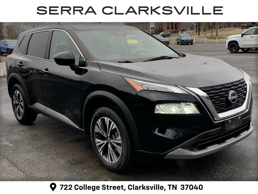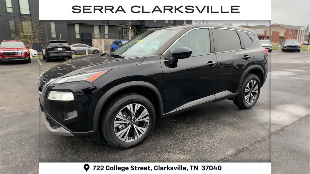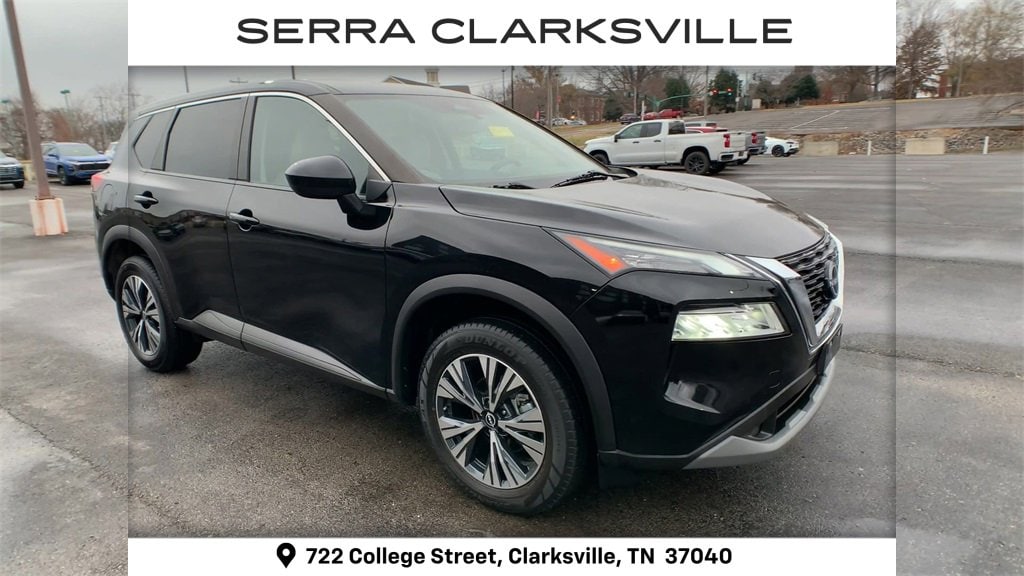 The Pre-Owned 2023 Nissan Rogue SV with 1.5L I3 Turbocharged DOHC 12V LEV3-ULEV50 201hp at Serra Clarksville. Well equipped: 18 Aluminum Alloy Wheels, 4-Wheel Disc Brakes, 5.604 Axle Ratio, 6 Speakers, ABS brakes, Air Conditioning, Alloy wheels, AM/FM Radio, AM/FM radio: SiriusXM, Auto High-beam Headlights, Automatic temperature control, Brake assist, Bumpers: body-color, Cloth Seat Trim, Delay-off headlights, Driver door bin, Driver vanity mirror, Dual front impact airbags, Dual front side impact airbags, Electronic Stability Control, Emergency communication system: NissanConnect Services, Four wheel independent suspension, Front anti-roll bar, Front Bucket Seats, Front Center Armrest, Front dual zone A/C, Front reading lights, Fully automatic headlights, Heated door mirrors, Illuminated entry, Knee airbag, Low tire pressure warning, NissanConnect featuring Apple CarPlay and Android Auto, Occupant sensing airbag, Outside temperature display, Overhead airbag, Overhead console, Panic alarm, Passenger door bin, Passenger vanity mirror, Power door mirrors, Power driver seat, Power steering, Power windows, Radio data system, Rear anti-roll bar, Rear Parking Sensors, Rear seat center armrest, Rear side impact airbag, Rear window defroster, Rear window wiper, Remote keyless entry, Speed control, Speed-Sensitive Wipers, Split folding rear seat, Spoiler, Steering wheel mounted audio controls, Tachometer, Telescoping steering wheel, Tilt steering wheel, Traction control, Trip computer, and Variably intermittent wipers.