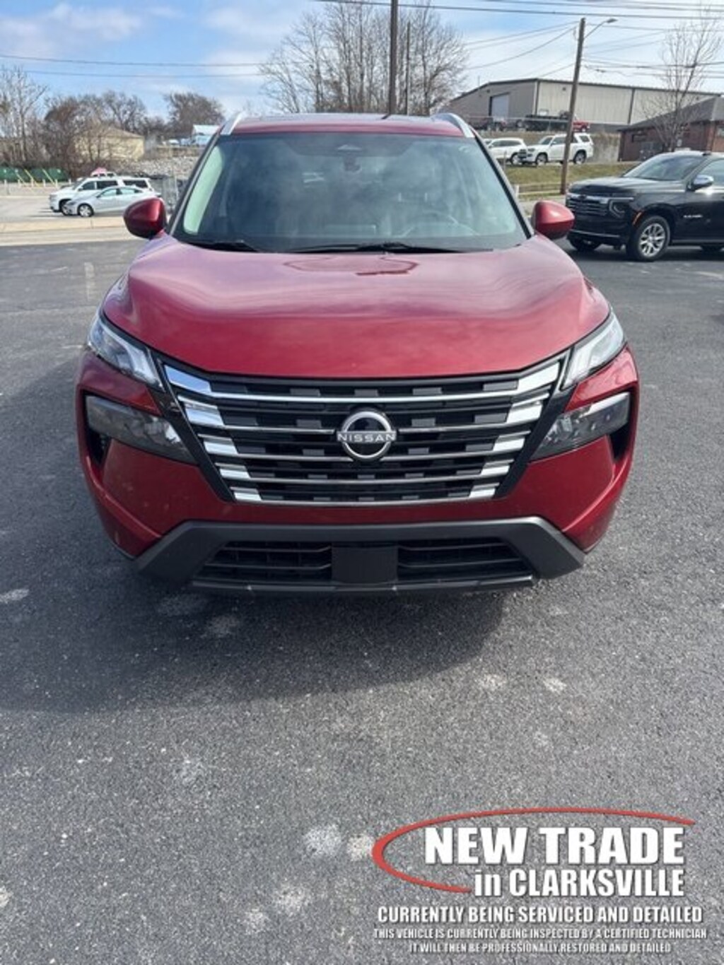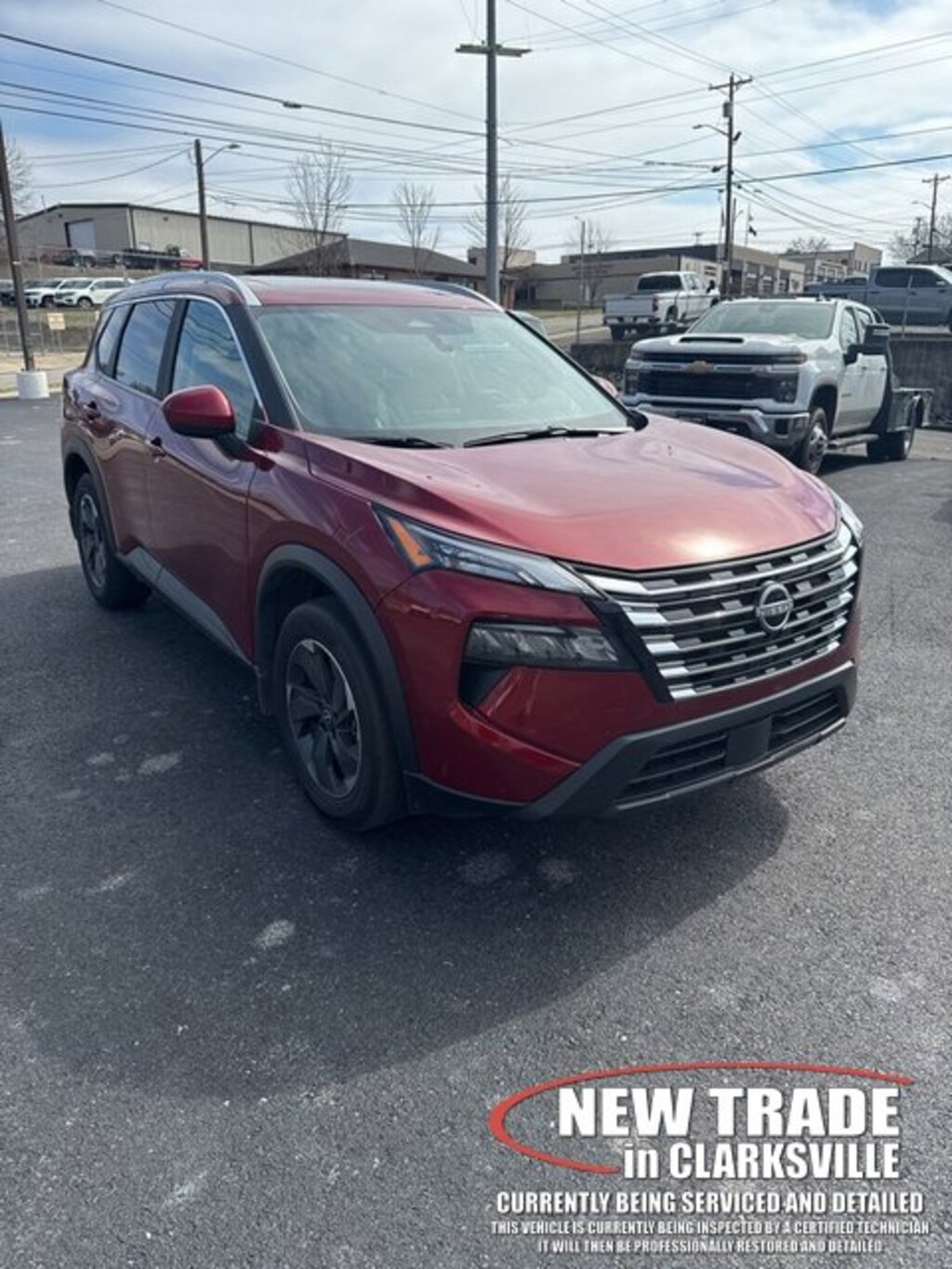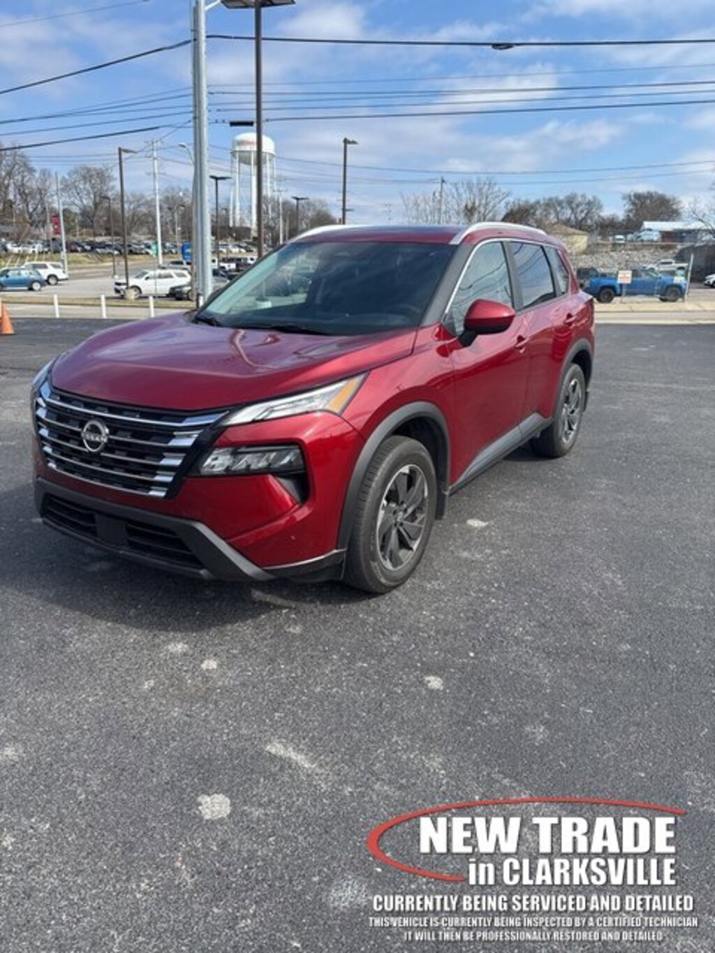 The Pre-Owned 2025 Nissan Rogue SV with 1.5L DOHC at Serra Clarksville. Well equipped: SV Premium Package (Heated Front Seats, Heated Steering Wheel, Leatherette Door Trim Inserts with Stitch, Panoramic Moonroof, Prima-Tex Leatherette Seat Trim, Rear Door Sunshades, Rear Personal Lights, and Silver Painted Roof Rails), 4-Wheel Disc Brakes, 6 Speakers, ABS brakes, Air Conditioning, Alloy wheels, AM/FM radio: SiriusXM, Android Auto and Apple CarPlay, Auto High-beam Headlights, Automatic temperature control, Black Splash Guards (set of 4), Brake assist, Bumpers: body-color, Chrome Rear Bumper Protector, Cloth Seat Trim with Patterned Inserts, Delay-off headlights, Driver door bin, Driver vanity mirror, Dual front impact airbags, Dual front side impact airbags, Electronic Stability Control, Emergency communication system: NissanConnect Services, First Aid Kit, Floor Mats with 1-Piece Cargo Area Protector, Four wheel independent suspension, Front anti-roll bar, Front Bucket Seats, Front Bucket Seats with 8-Way Power Driver Seat, Front Center Armrest, Front dual zone A/C, Front reading lights, Fully automatic headlights, Heated door mirrors, Illuminated entry, Knee airbag, Low tire pressure warning, Occupant sensing airbag, Outside temperature display, Overhead airbag, Overhead console, Panic alarm, Passenger door bin, Passenger vanity mirror, Power door mirrors, Power driver seat, Power Liftgate, Power steering, Power windows, Premium Paint, Radio data system, Radio: NissanConnect with 6 Speakers, Rear anti-roll bar, Rear seat center armrest, Rear side impact airbag, Rear window defroster, Rear window wiper, Remote keyless entry, Speed control, Speed-sensing steering, Speed-Sensitive Wipers, Split folding rear seat, Spoiler, Steering wheel mounted audio controls, Tachometer, Telescoping steering wheel, Tilt steering wheel, Traction control, Trip computer, Variably intermittent wipers, and Wheels: 18 Dark Painted Machine Finished Alloy.