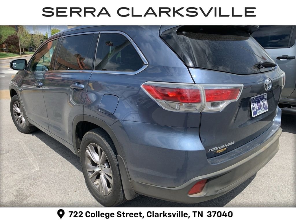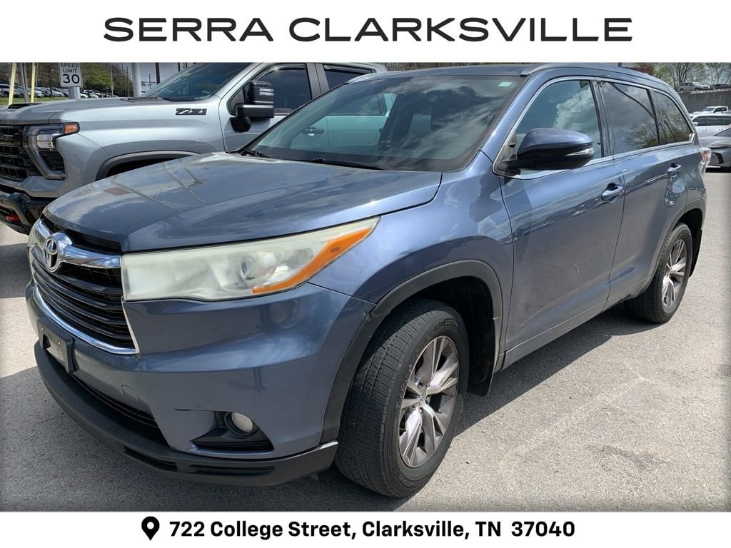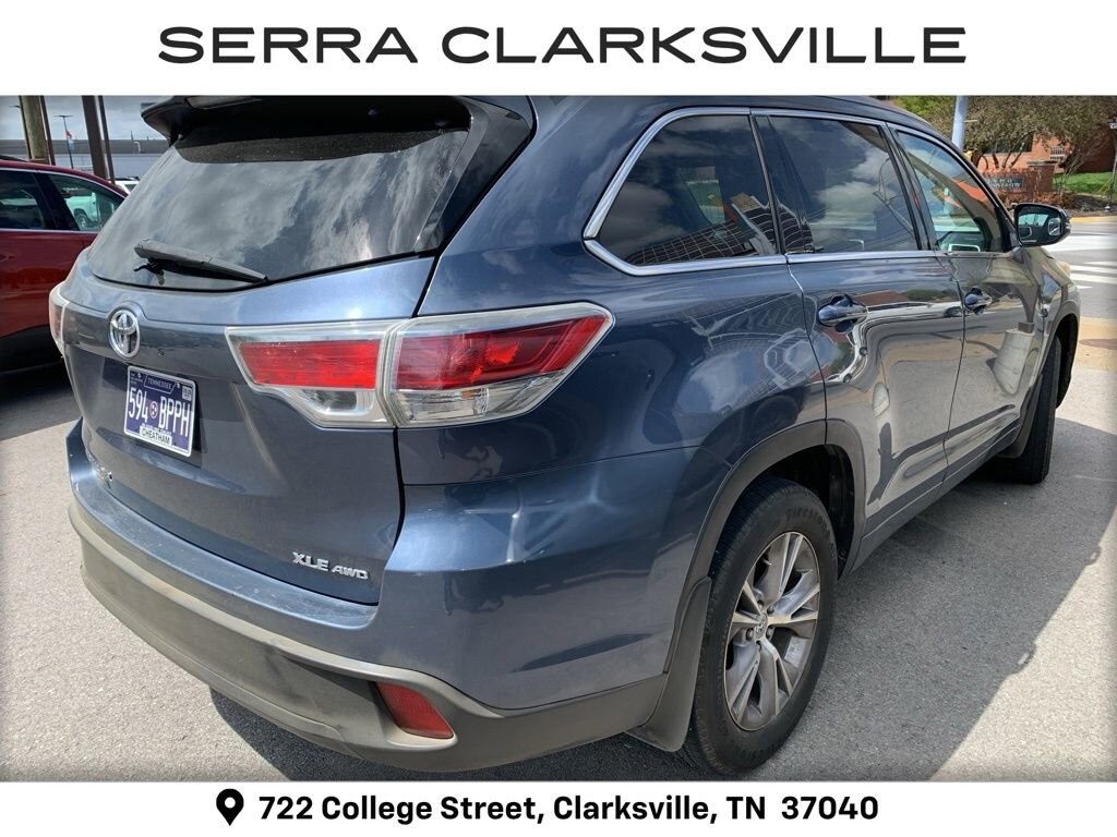 The Pre-Owned 2014 Toyota Highlander XLE V6 with 3.5L V6 DOHC Dual VVT-i 24V at Serra Clarksville. Well equipped: AWD, 18 Alloy Wheels, 3rd row seats: split-bench, 4-Wheel Disc Brakes, 4.154 Axle Ratio, 6 Speakers, ABS brakes, Air Conditioning, All Weather Floor Mats & Cargo Liner, Alloy wheels, AM/FM radio: SiriusXM, Anti-whiplash front head restraints, Auto-dimming Rear-View mirror, Automatic temperature control, Brake assist, Bumpers: body-color, CD player, Delay-off headlights, Driver door bin, Driver vanity mirror, Dual front impact airbags, Dual front side impact airbags, Electronic Stability Control, Exterior Parking Camera Rear, Four wheel independent suspension, Front anti-roll bar, Front Bucket Seats, Front Center Armrest, Front dual zone A/C, Front fog lights, Front reading lights, Fully automatic headlights, Garage door transmitter, Heated door mirrors, Heated front seats, Illuminated entry, Knee airbag, Leather Shift Knob, Low tire pressure warning, Navigation System, Occupant sensing airbag, Outside temperature display, Overhead airbag, Overhead console, Panic alarm, Passenger door bin, Passenger vanity mirror, Power door mirrors, Power driver seat, Power Liftgate, Power moonroof, Power steering, Power windows, Radio: Entune Premium Audio w/Nav & App Suite, Rear air conditioning, Rear anti-roll bar, Rear reading lights, Rear window defroster, Rear window wiper, Reclining 3rd row seat, Remote keyless entry, Roof rack: rails only, Security system, Smooth Leather Seat Material, Speed control, Speed-sensing steering, Split folding rear seat, Spoiler, Steering wheel mounted audio controls, Tachometer, Telescoping steering wheel, Tilt steering wheel, Traction control, Trip computer, Turn signal indicator mirrors, and Variably intermittent wipers.