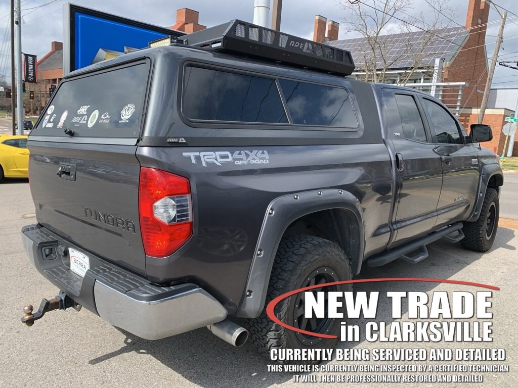 CARFAX One-Owner. Magnetic Gray 2018 Toyota Tundra SR5 TRD OFFROADThe Pre-Owned 2018 Toyota Tundra SR5 with 5.7L 8-Cylinder SMPI DOHC at Serra Clarksville. Well equipped: Fabric Seat Trim w/TRD Off Road Package, SR5 Upgrade Package (38 Gallon Fuel Tank Capacity, Anti-Theft Immobilizer w/Alarm, Auto-Dimming Rear-View Mirror, Compass, Front Bucket Seats, HomeLink Universal Transceiver, and Urethane Tilt/Telescopic Steering Wheel), TRD Off Road Package (Bedside TRD Off Road Decal, Illuminated Entry System, LED Front Fog & Driving Lights, LED Headlights w/Smoked Housings, Rear Side Privacy Glass, Rear Under-Seat Storage Compartment, Sliding Rear Window w/Privacy Glass, Trail-Tuned Bilstein Shock Absorbers, TRD Off Road Floor Mats, and Wheels: 18 x 8J Split 5-Spoke TRD Off Road Alloy), 4WD, Black Cloth, 18 x 8J Styled Steel Wheels, 3-Passenger Front Bench Seat, 4-Wheel Disc Brakes, 4.30 Axle Ratio, 6 Speakers, ABS brakes, Air Conditioning, All Weather Floor Liner & Door Sill Protector Pkg, AM/FM radio: SiriusXM, Auto High-beam Headlights, Brake assist, CD player, Delay-off headlights, Driver door bin, Driver vanity mirror, Dual front impact airbags, Dual front side impact airbags, Electronic Stability Control, Exterior Parking Camera Rear, Fabric Seat Trim, Front anti-roll bar, Front Center Armrest w/Storage, Front Fog & Daytime Running Lights, Front fog lights, Front reading lights, Front wheel independent suspension, Fully automatic headlights, Heated door mirrors, Illuminated entry, Knee airbag, Low tire pressure warning, Occupant sensing airbag, Outside temperature display, Overhead airbag, Overhead console, Panic alarm, Passenger door bin, Passenger vanity mirror, Power door mirrors, Power steering, Power windows, Radio: Entune Audio Display AM/FM/HD w/CD Player, Rear reading lights, Rear step bumper, Remote keyless entry, Speed control, Speed-sensing steering, Split folding rear seat, Tachometer, Tilt steering wheel, Traction control, TRD Shift Knob, Trip computer, Variably intermittent wipers, and Voltmeter.4WD 5.7L 8-Cylinder SMPI DOHC 6-Speed Automatic Electronic with OverdriveRecent Arrival! Odometer is 25151 miles below market average!Awards:* 2018 KBB.com Best Resale Value Awards * 2018 KBB.com 10 Most Awarded Brands