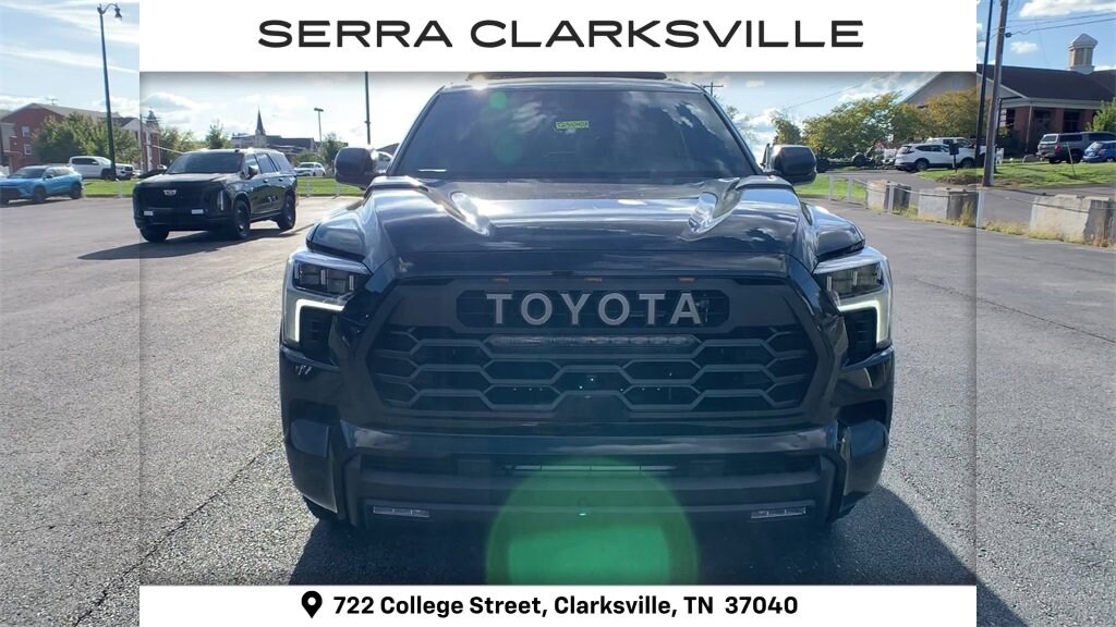 One-owner local new car trade-in! Clean CARFAX. The Pre-Owned 2024 Toyota Sequoia TRD Pro with V6 Hybrid at Serra Clarksville. Well equipped: Tow Technology Package, TRD Pro Package (Cast Aluminum Step & Step Cover, Fold & Tumble Rear Seat, JBL 14 Speakers, Multi-Terrain Back Monitor, Pro High Grade Full LED Headlamps, TRD Pro Leather-Trimmed Steering Wheel, TRD Pro LED Light Bar, TRD Pro Under Cover & Protector, and Wireless Smartphone Charger), V6 Hybrid, 10-Speed Automatic, 4WD, 14 Speakers, 3.31 Axle Ratio, 3rd row seats: split-bench, 4-Wheel Disc Brakes, ABS brakes, Air Conditioning, Alloy wheels, AM/FM radio: SiriusXM, Anti-whiplash front head restraints, Apple CarPlay/Android Auto, Auto High-beam Headlights, Auto-dimming door mirrors, Auto-dimming Rear-View mirror, Automatic temperature control, Brake assist, Bumpers: body-color, Compass, Delay-off headlights, Driver door bin, Driver vanity mirror, Dual front impact airbags, Dual front side impact airbags, Electronic Stability Control, Emergency communication system: Safety Connect (10-year trial), Exterior Parking Camera Rear, Front anti-roll bar, Front Bucket Seats, Front Center Armrest w/Storage, Front dual zone A/C, Front fog lights, Front reading lights, Front wheel independent suspension, Fully automatic headlights, Garage door transmitter: HomeLink, Headlight cleaning, Heated & Ventilated Front Seats, Heated door mirrors, Heated front seats, Heated steering wheel, Illuminated entry, Knee airbag, Leather Shift Knob, Leather steering wheel, Low tire pressure warning, Memory seat, Navigation system: Drive Connect (1 year trial) includes Cloud Navigation with real time traffic and Google POI, Occupant sensing airbag, Outside temperature display, Overhead airbag, Overhead console, Paint Protection Film (TMS), Panic alarm, Passenger door bin, Passenger vanity mirror, Power door mirrors, Power driver seat, Power moonroof, Power passenger seat, Power steering, Power Tilt/Slide Panoramic Roof w/Power Sunshade, Power windows, Premium audio system: JBL, Radio: JBL Premium Audio System, Rear air conditioning, Rear reading lights, Rear seat center armrest, Rear window defroster, Rear window wiper, Reclining 3rd row seat, Remote keyless entry, Security system, Speed control, Speed-sensing steering, Split folding rear seat, Spoiler, Sport steering wheel, Steering wheel mounted audio controls, Tachometer, Telescoping steering wheel, Tilt steering wheel, Traction control, TRD Pro SofTex Seat Trim, TRD Roof Rack (TMS), Trip computer, Turn signal indicator mirrors, Variably intermittent wipers, Ventilated front seats, Voltmeter, and Wheels: 20 Machined-Finish Alloy.