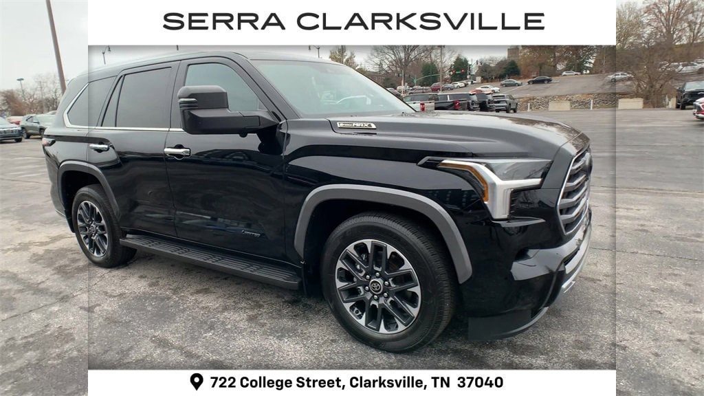 The Pre-Owned 2024 Toyota Sequoia Limited with V6 Hybrid at Serra Clarksville. Well equipped: Tow Technology Package, V6 Hybrid, 10-Speed Automatic, 4WD, 3.31 Axle Ratio, 3rd row seats: split-bench, 4-Wheel Disc Brakes, 8 Speakers, ABS brakes, Air Conditioning, All-Weather Liners/Cargo Mat (TMS), Alloy wheels, AM/FM radio: SiriusXM, Anti-whiplash front head restraints, Apple CarPlay/Android Auto, Auto High-beam Headlights, Auto-dimming door mirrors, Auto-dimming Rear-View mirror, Automatic temperature control, Black Heated Power Auto-Dim Outside Tow Mirrors, Brake assist, Bumpers: body-color, Cast Aluminum Step & Step Cover, Delay-off headlights, Door Edge Guard (TMS), Driver door bin, Driver vanity mirror, Dual front impact airbags, Dual front side impact airbags, Electronic Stability Control, Emergency communication system: Safety Connect (10-year trial), Exterior Parking Camera Rear, Front anti-roll bar, Front Bucket Seats, Front Center Armrest w/Storage, Front dual zone A/C, Front fog lights, Front reading lights, Front wheel independent suspension, Fully automatic headlights, Garage door transmitter: HomeLink, Headlight cleaning, Heated & Ventilated Front Seats, Heated door mirrors, Heated front seats, Heated steering wheel, Illuminated entry, JBL 14 Speakers, Knee airbag, Leather Shift Knob, Leather steering wheel, Low tire pressure warning, Memory seat, Navigation system: Drive Connect (1 year trial) includes Cloud Navigation with real time traffic and Google POI, Occupant sensing airbag, Outside temperature display, Overhead airbag, Overhead console, Panic alarm, Passenger door bin, Passenger vanity mirror, Power door mirrors, Power driver seat, Power Liftgate, Power moonroof, Power passenger seat, Power steering, Power windows, Radio: Toyota Multimedia w/14 Display, Rear air conditioning, Rear reading lights, Rear seat center armrest, Rear window defroster, Rear window wiper, Reclining 3rd row seat, Remote keyless entry, Security system, SofTex Seat Trim, Speed control, Speed-sensing steering, Split folding rear seat, Spoiler, Steering wheel mounted audio controls, Tachometer, Telescoping steering wheel, Tilt steering wheel, Traction control, Trip computer, Turn signal indicator mirrors, Variably intermittent wipers, Ventilated front seats, Voltmeter, Wheels: 20 Machined-Finish Alloy, and Wireless Smartphone Charger.